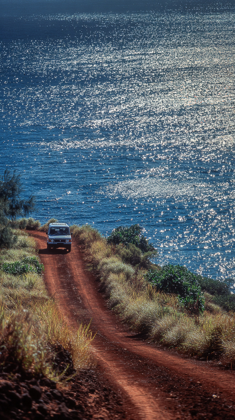 Винтажный белый Range Rover Classic едет по грунтовой дороге на утёсе с видом на Тихий океан (Кауаи, 1989 год).