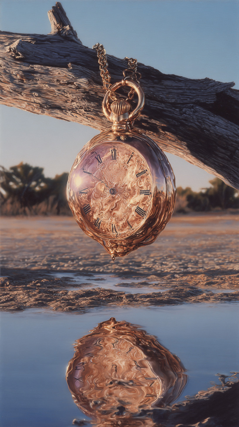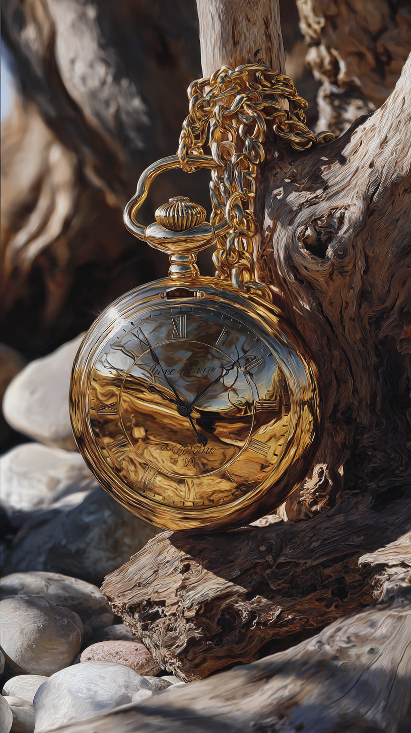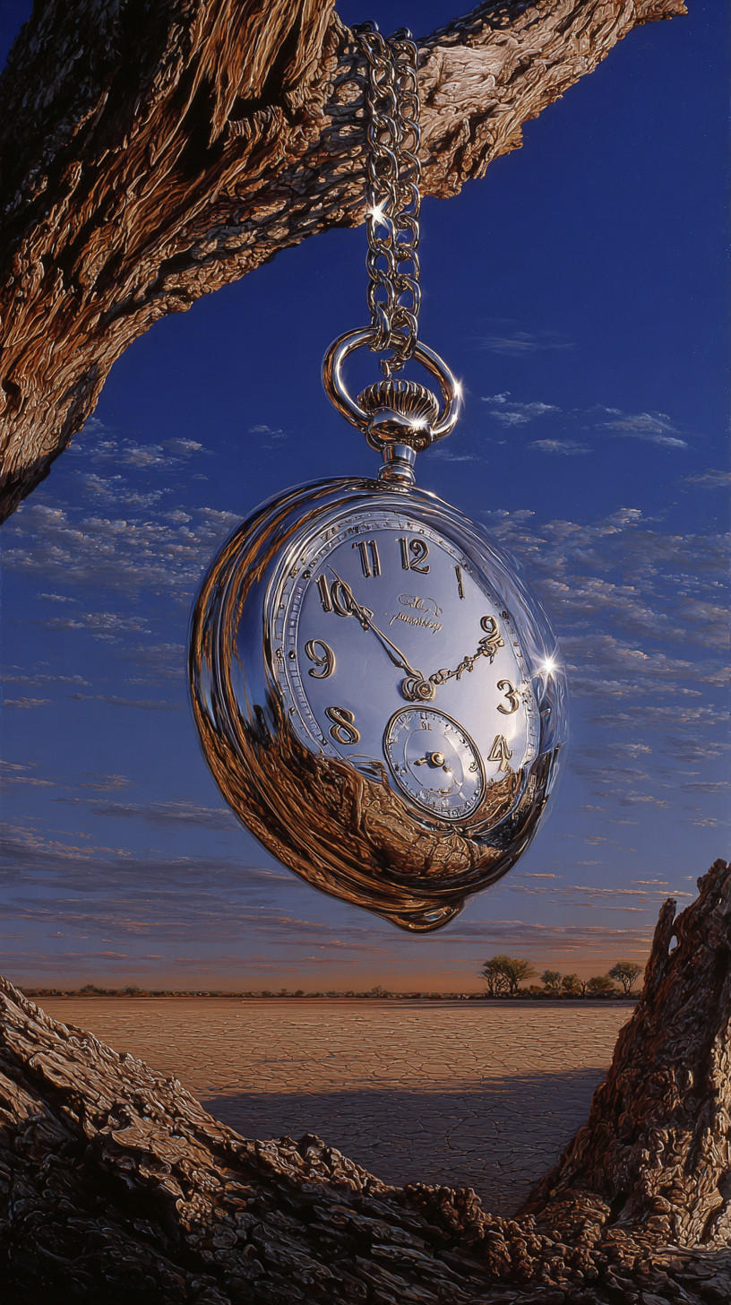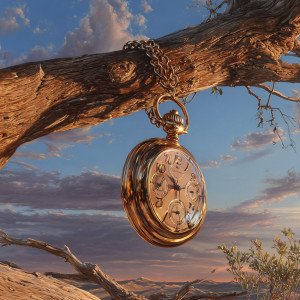 Оплавленные карманные часы, свисающие с ветки дерева, металлический блеск и детализированные отражения в пустынном пейзаже в час золотого заката.