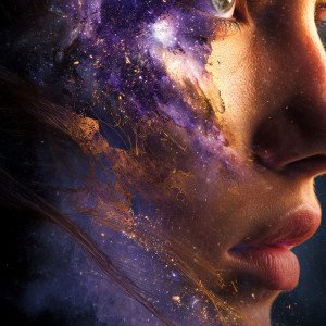 Крупный план женщины, чье лицо на одной стороне плавно переходит в космическую галактику.