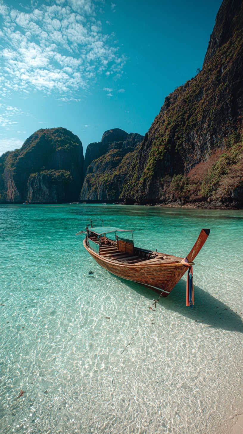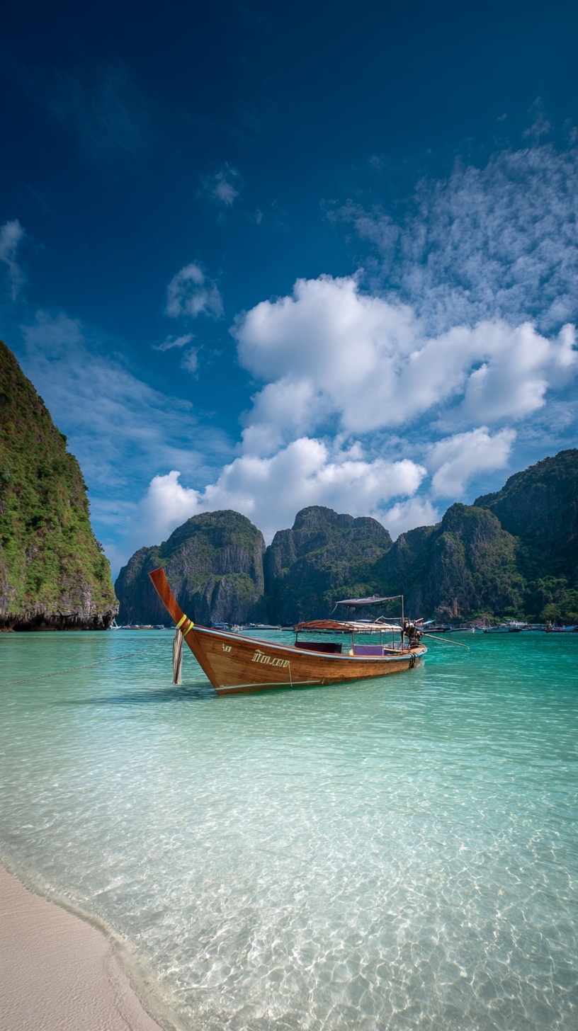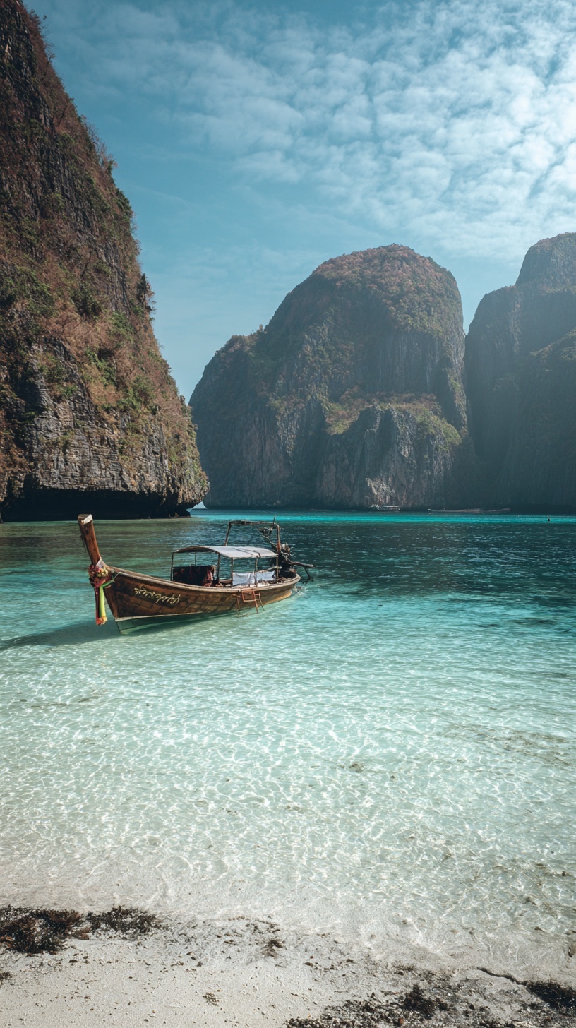 Лодка в заливе Майя на пляже Ко Пхи Пхи Ле.