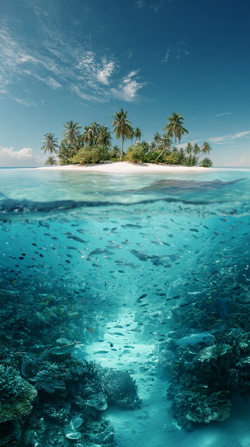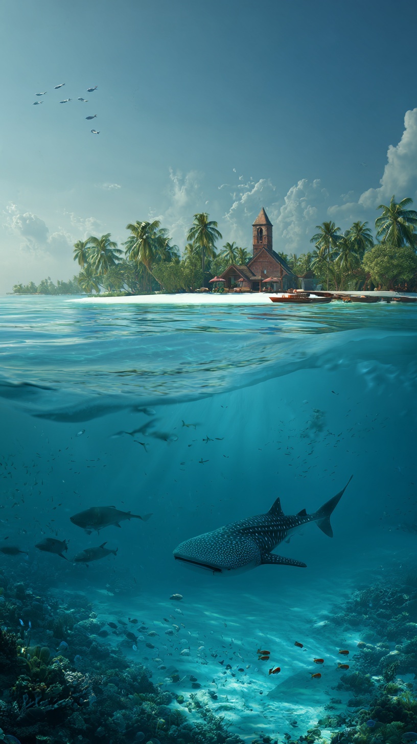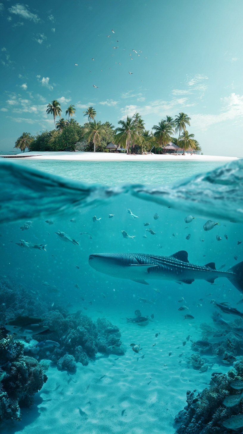 Подводный мир мальдивского рифа с рыбами и остров с белым песком, пальмами. В центре кадра китовая акула плывёт на зрителя.