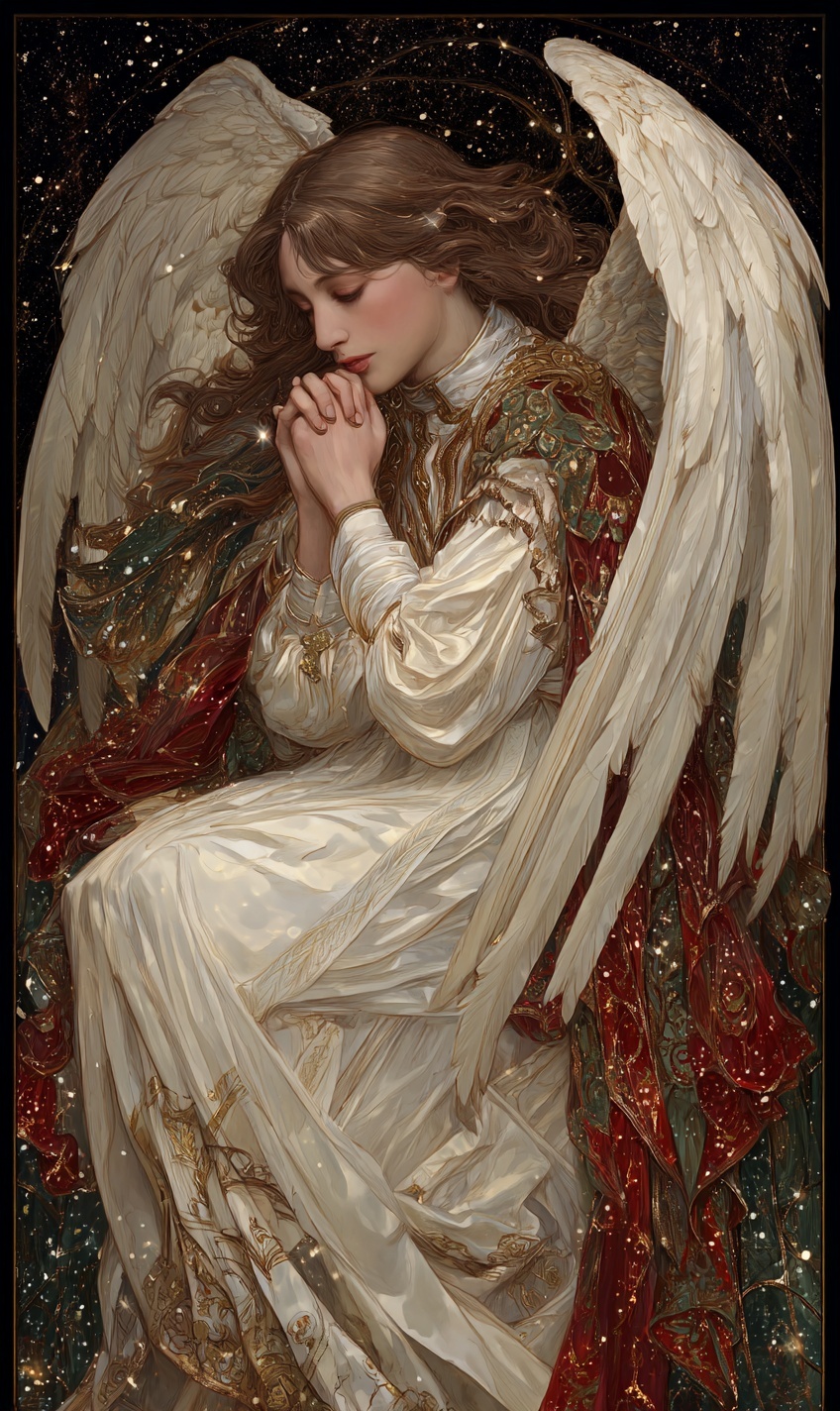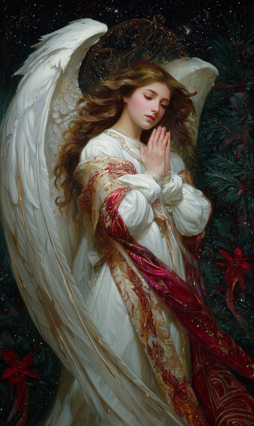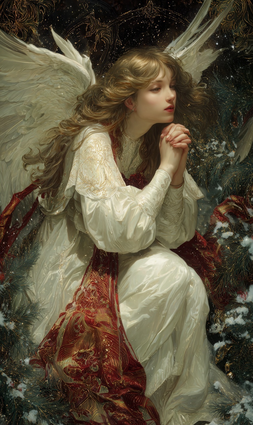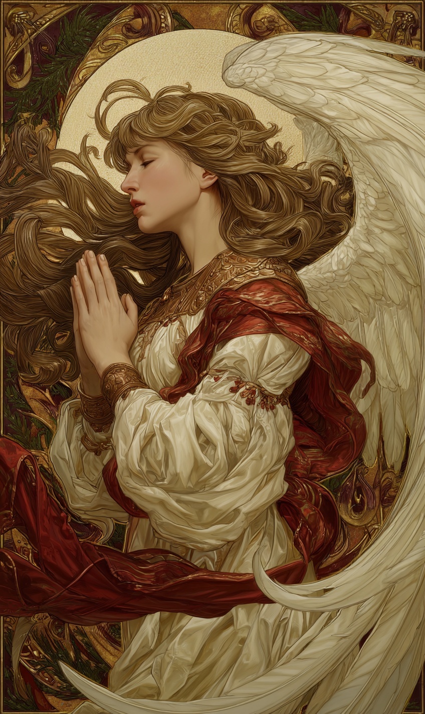 Изображение рождественского ангела милосердия в стиле Альфонса Мухи и Рембрандта.