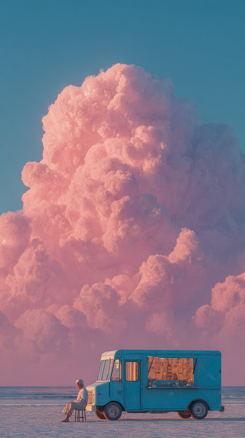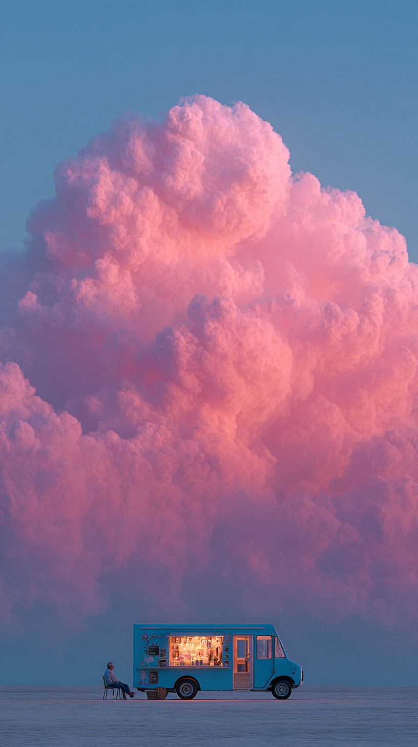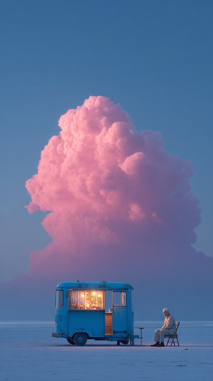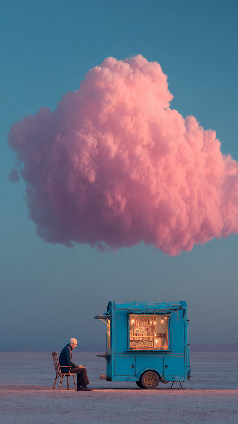 Винтажный синий фудтрак, рядом сидит пожилой мужчина, на небе — гигантское розовое облако.