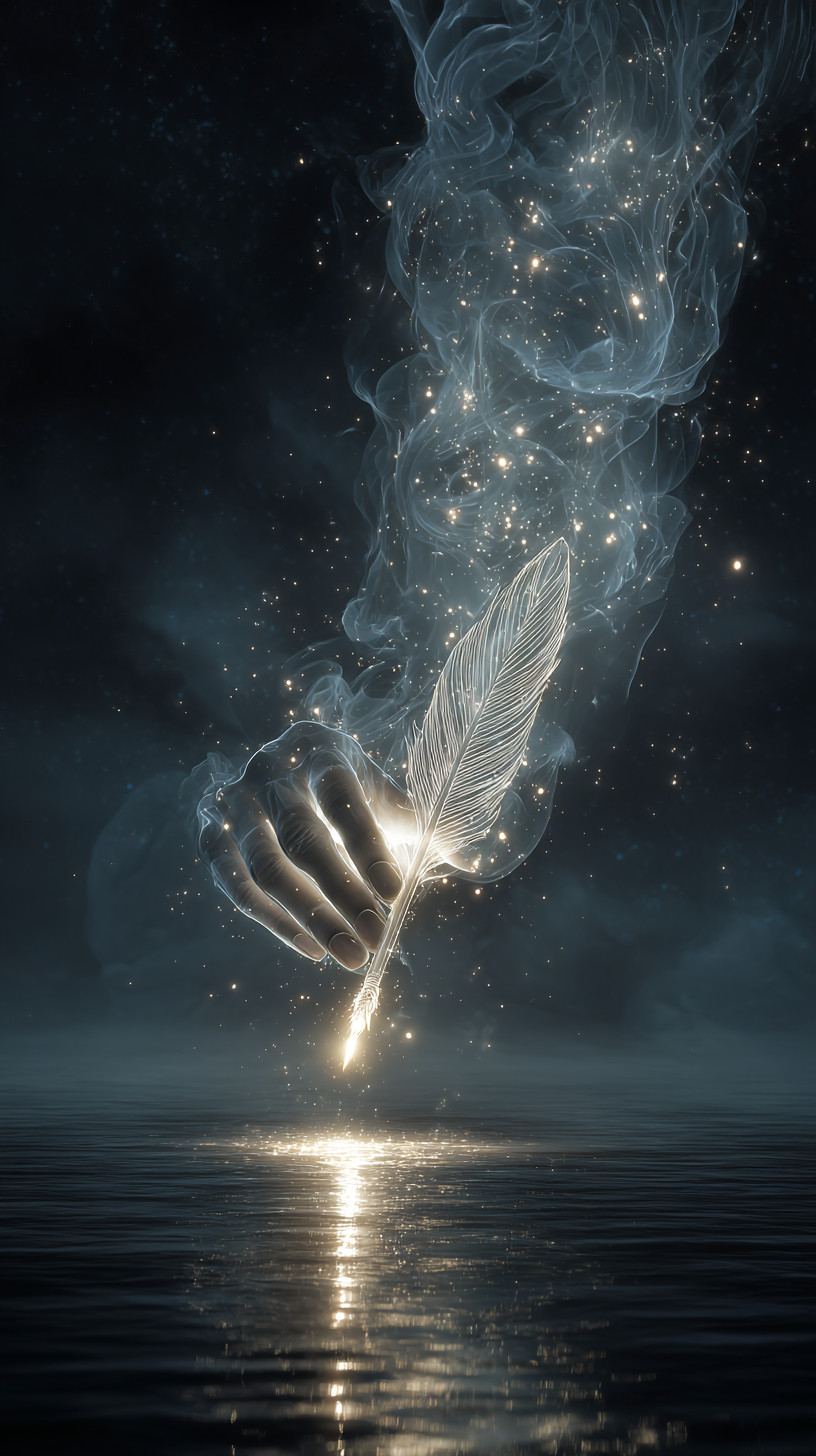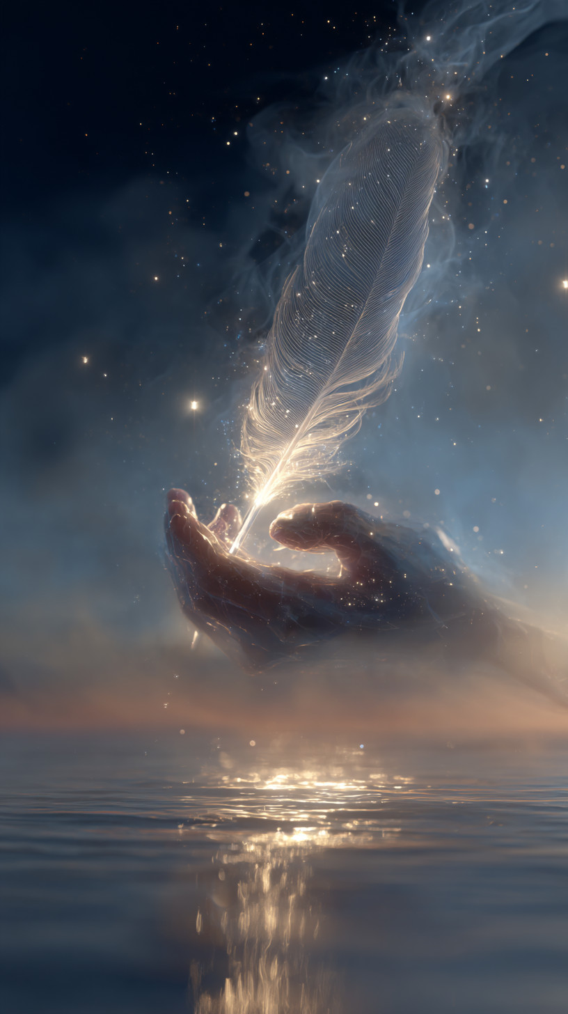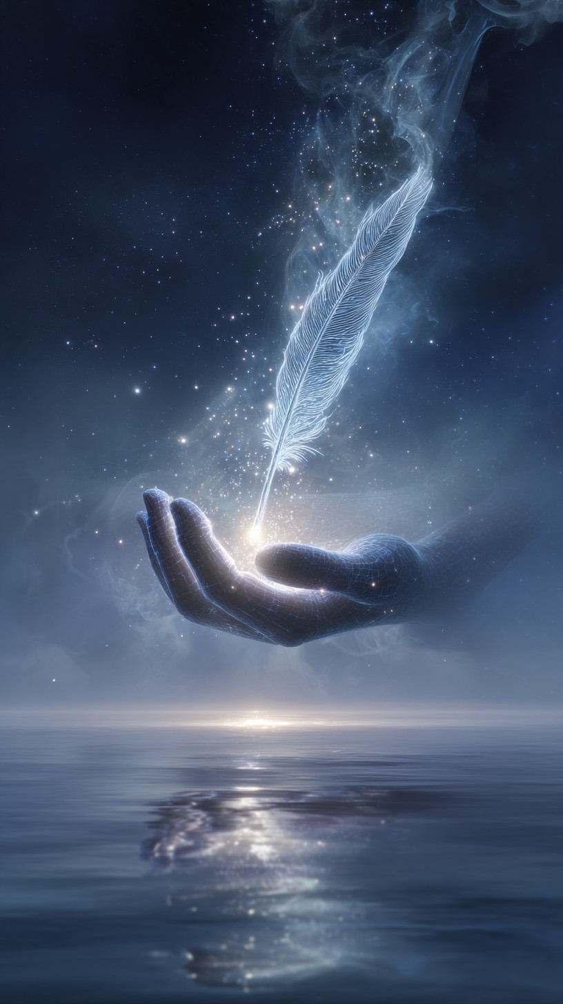 Сюрреалистичное изображение руки из чистого света, держащей светящееся перо над морем звёзд.