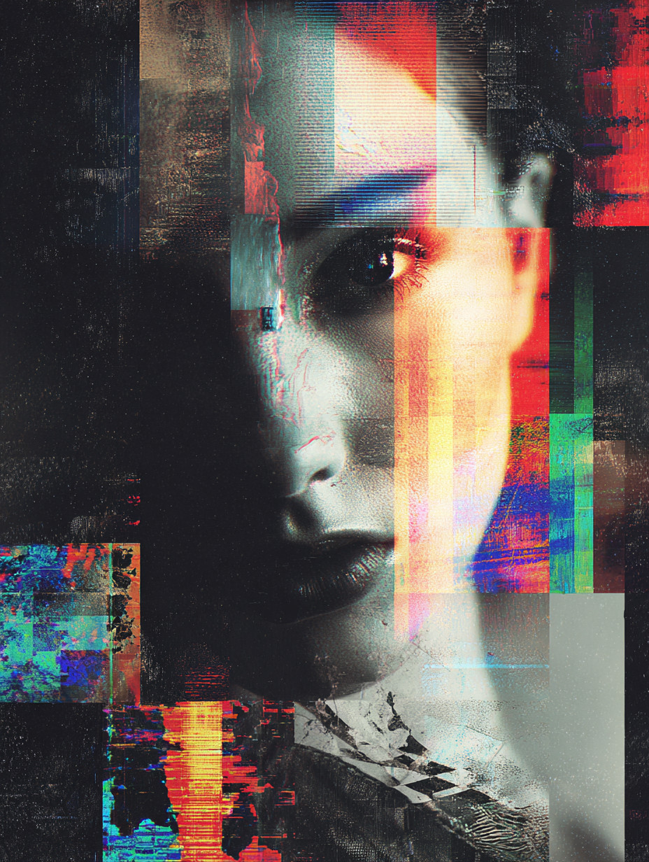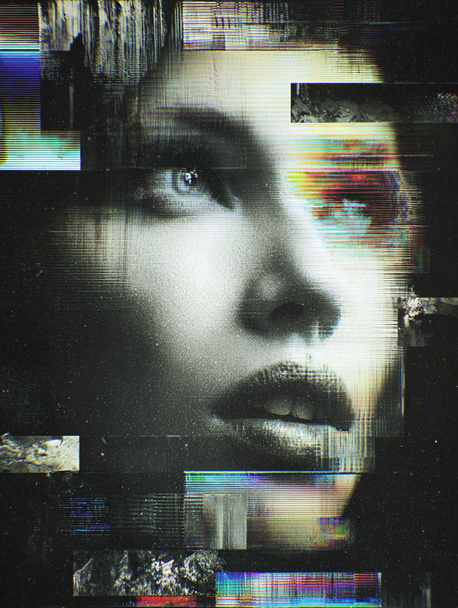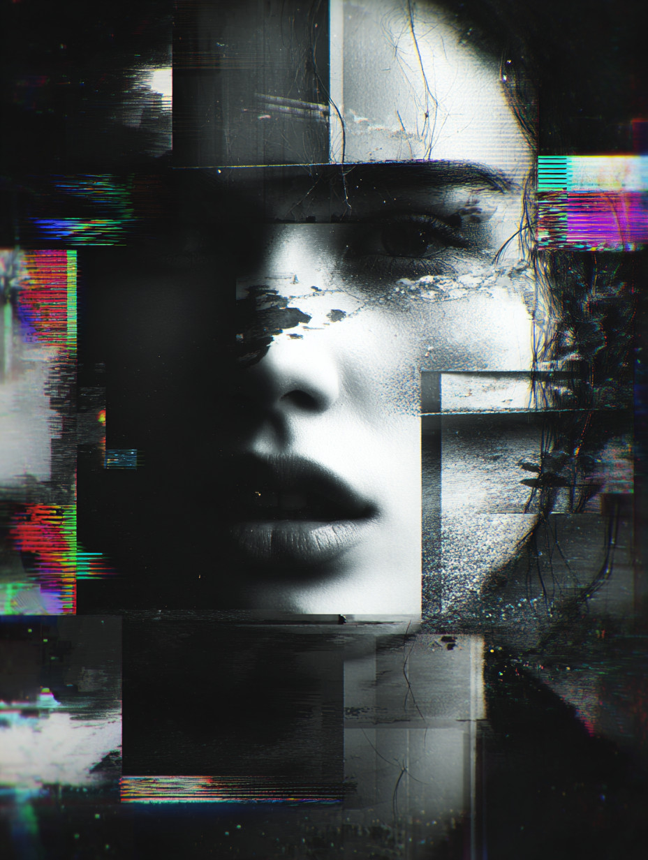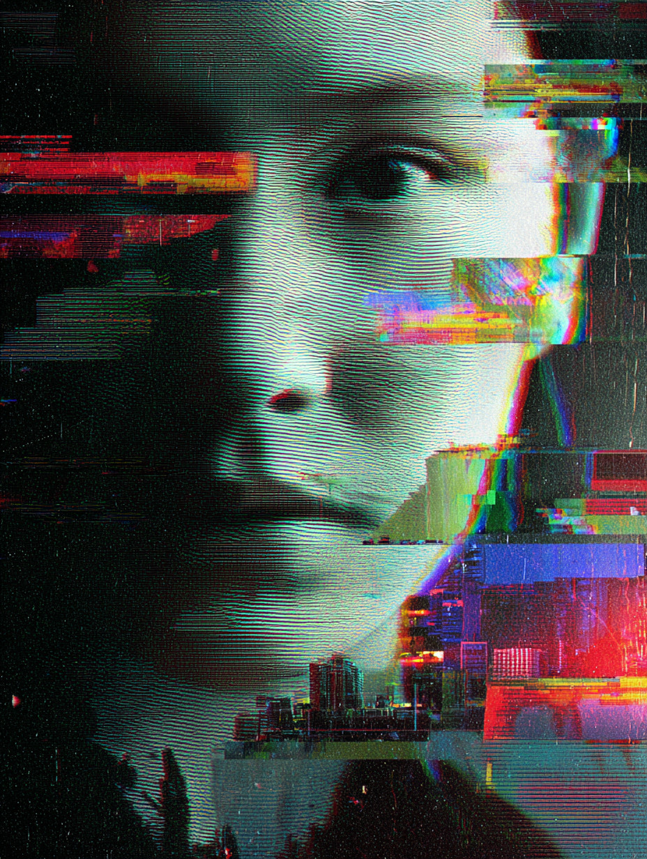 Абстрактные городские текстуры смешиваются с лицом, хаотичная композиция, высокий контраст, мрачные тона.