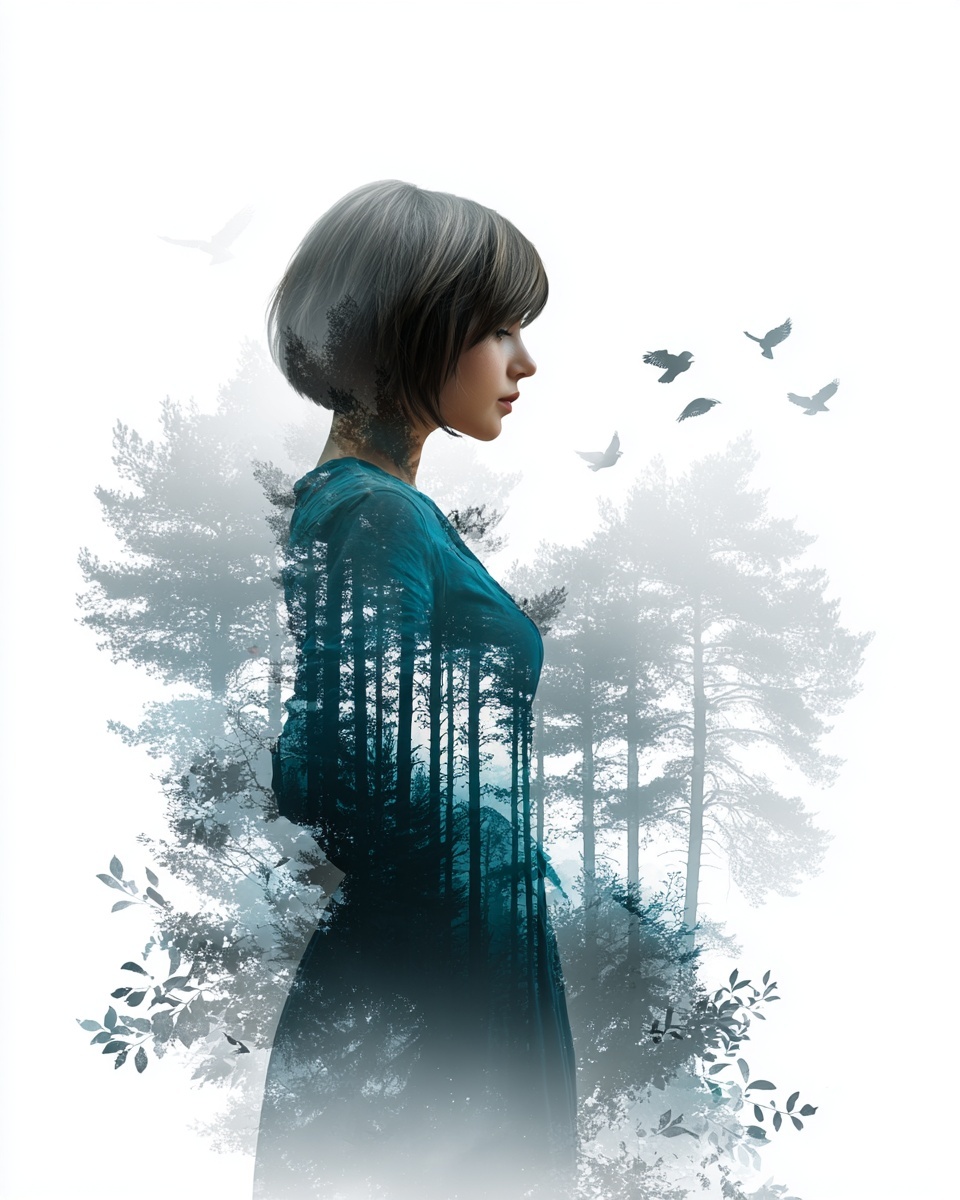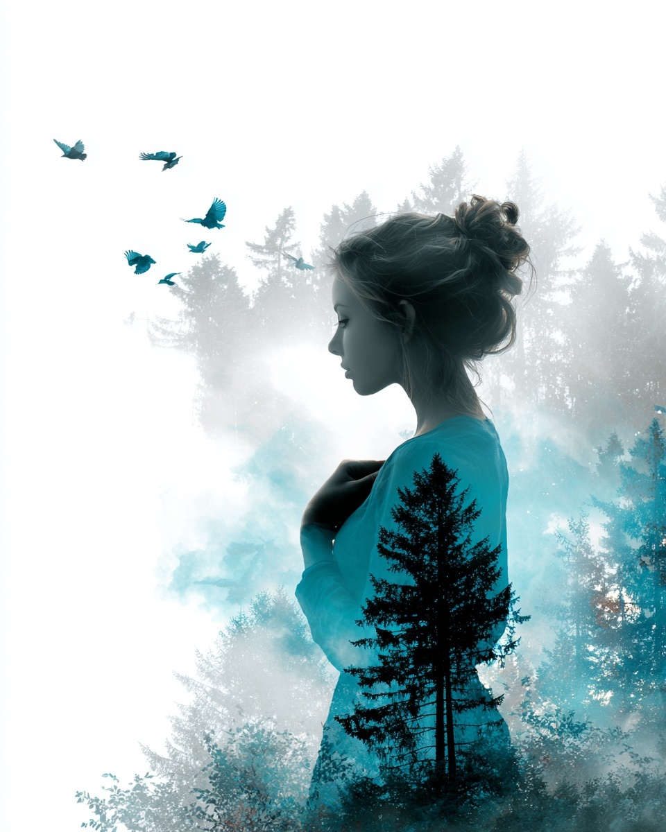 Художественный портрет в технике двойной экспозиции: силуэт женщины, совмещённый с туманным сосновым лесом и летящими птицами.