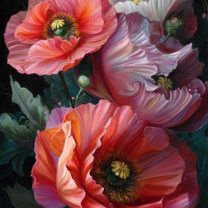 Крупный план двух больших розовых маков, окружённых розами различных оттенков и зелёными листьями, с белыми точками и завитками. Вдохновение стилями Луиса Рикардо Фалеро и Караваджо.