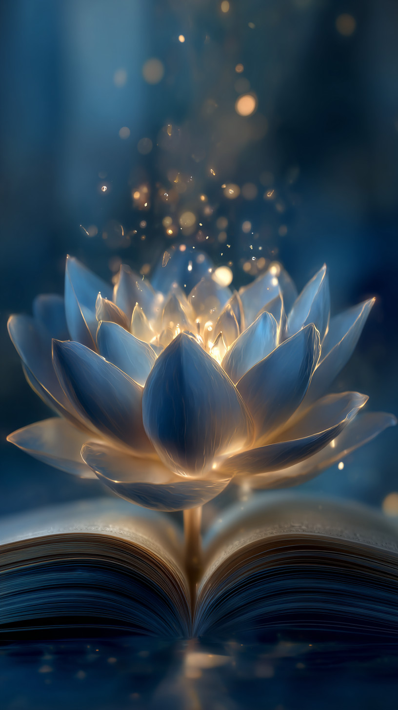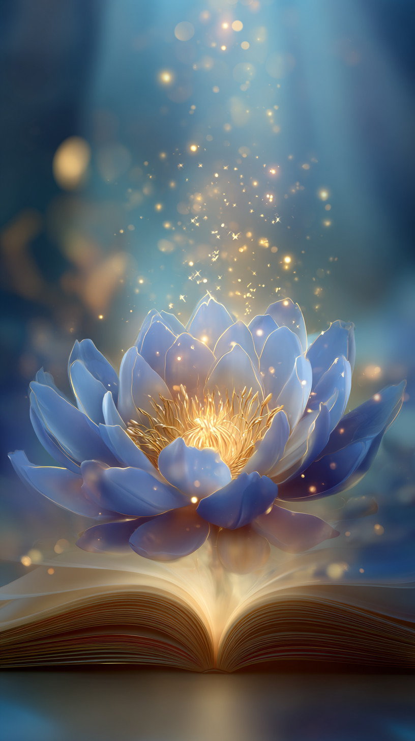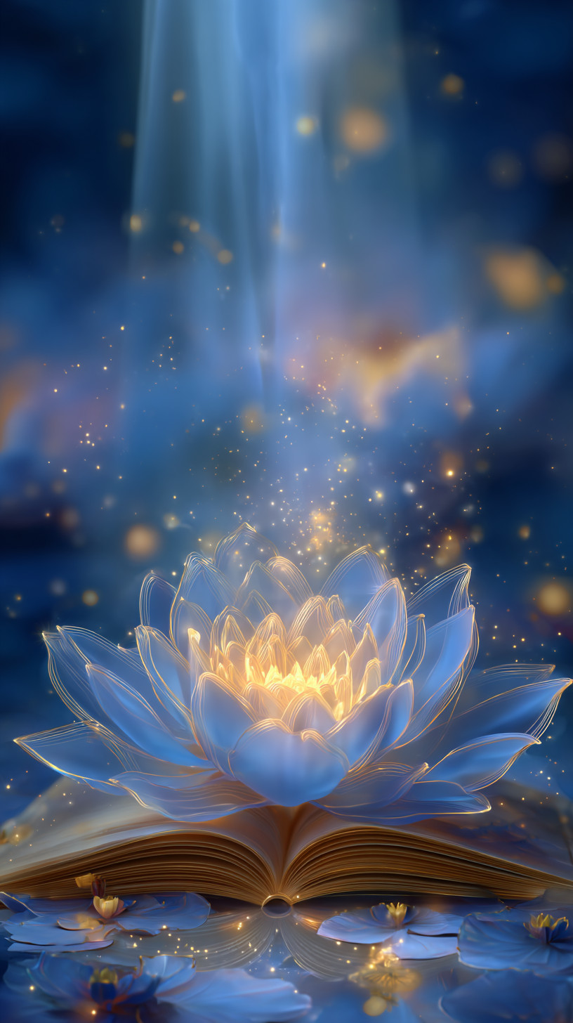 В центре — светящийся золотой лотос, излучающий энергию. Раскрытая книга испускает вверх поток света, мягкие сверкающие эффекты.