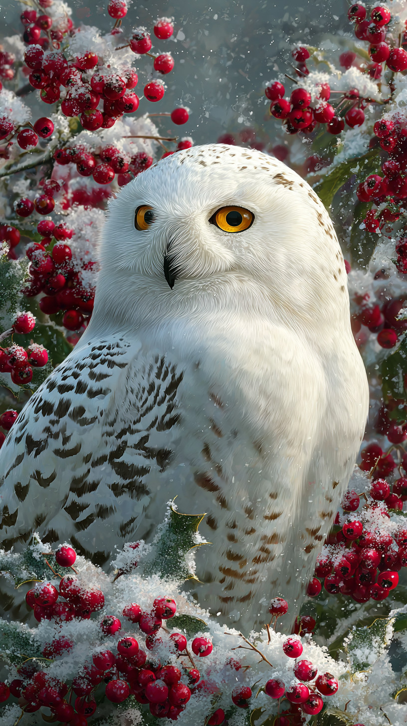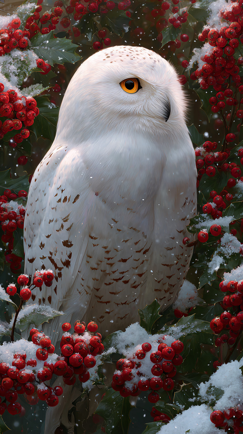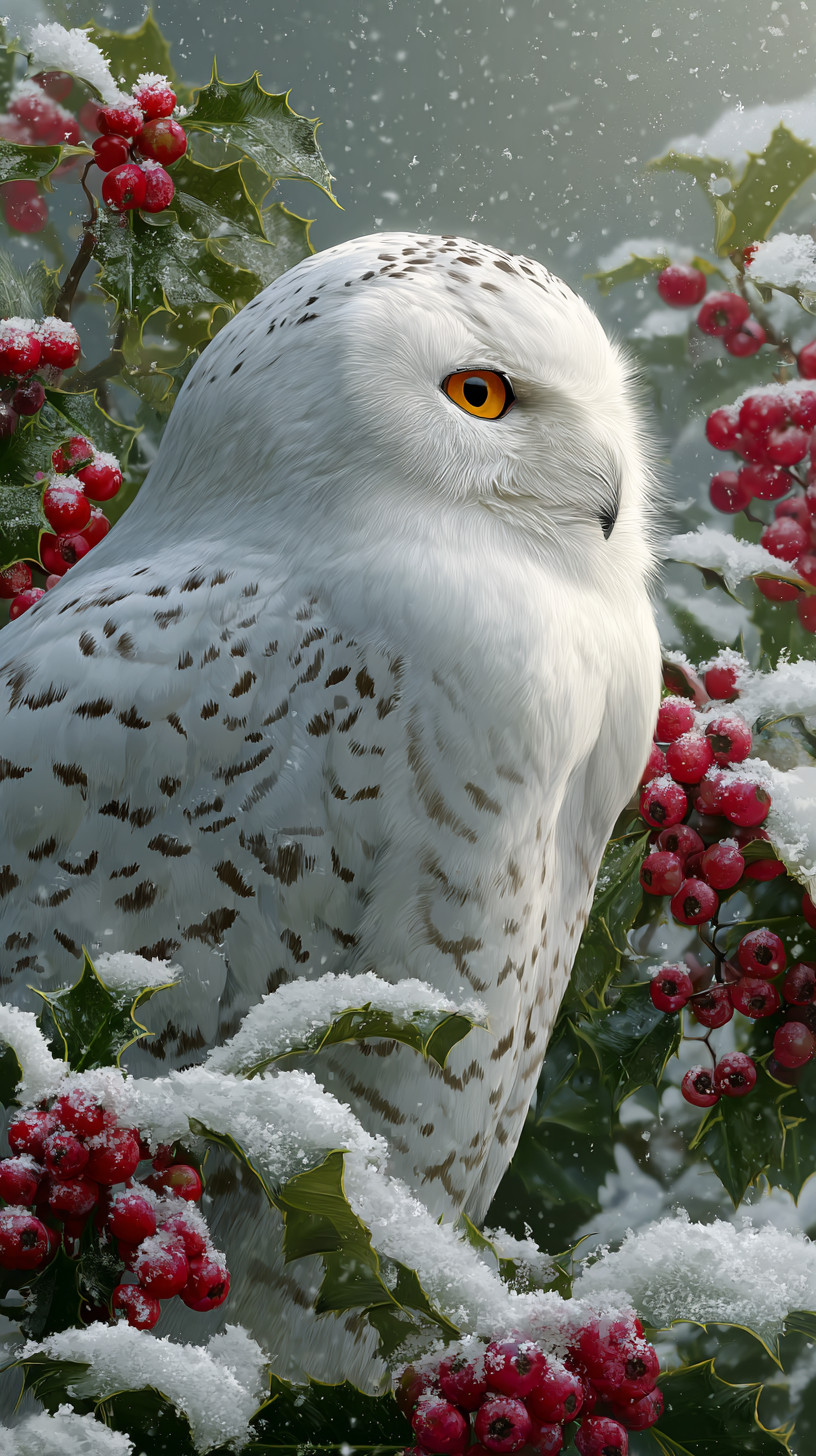 Белая сова сидит на заснеженных ветках остролиста с алыми ягодами. Падает снег, создавая спокойную зимнюю атмосферу.