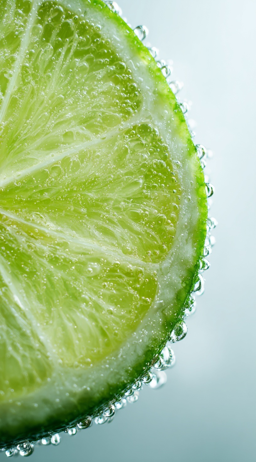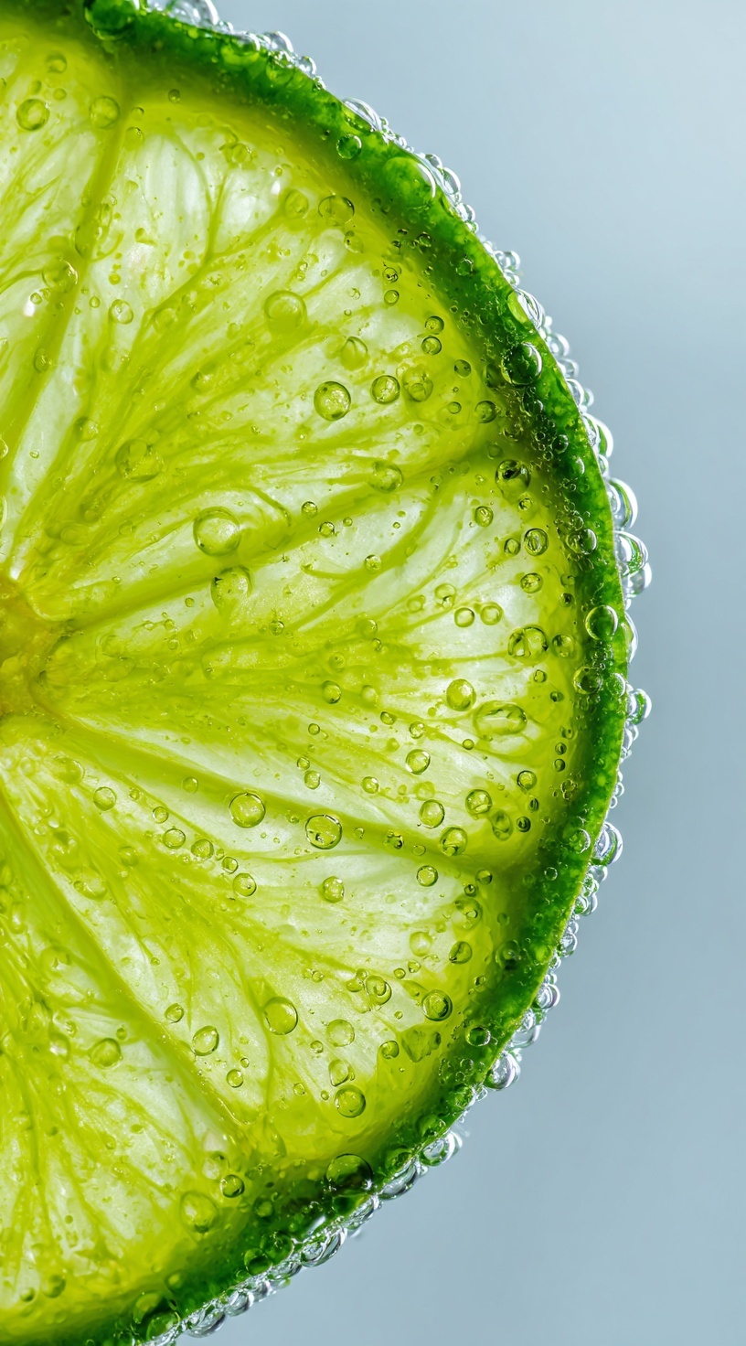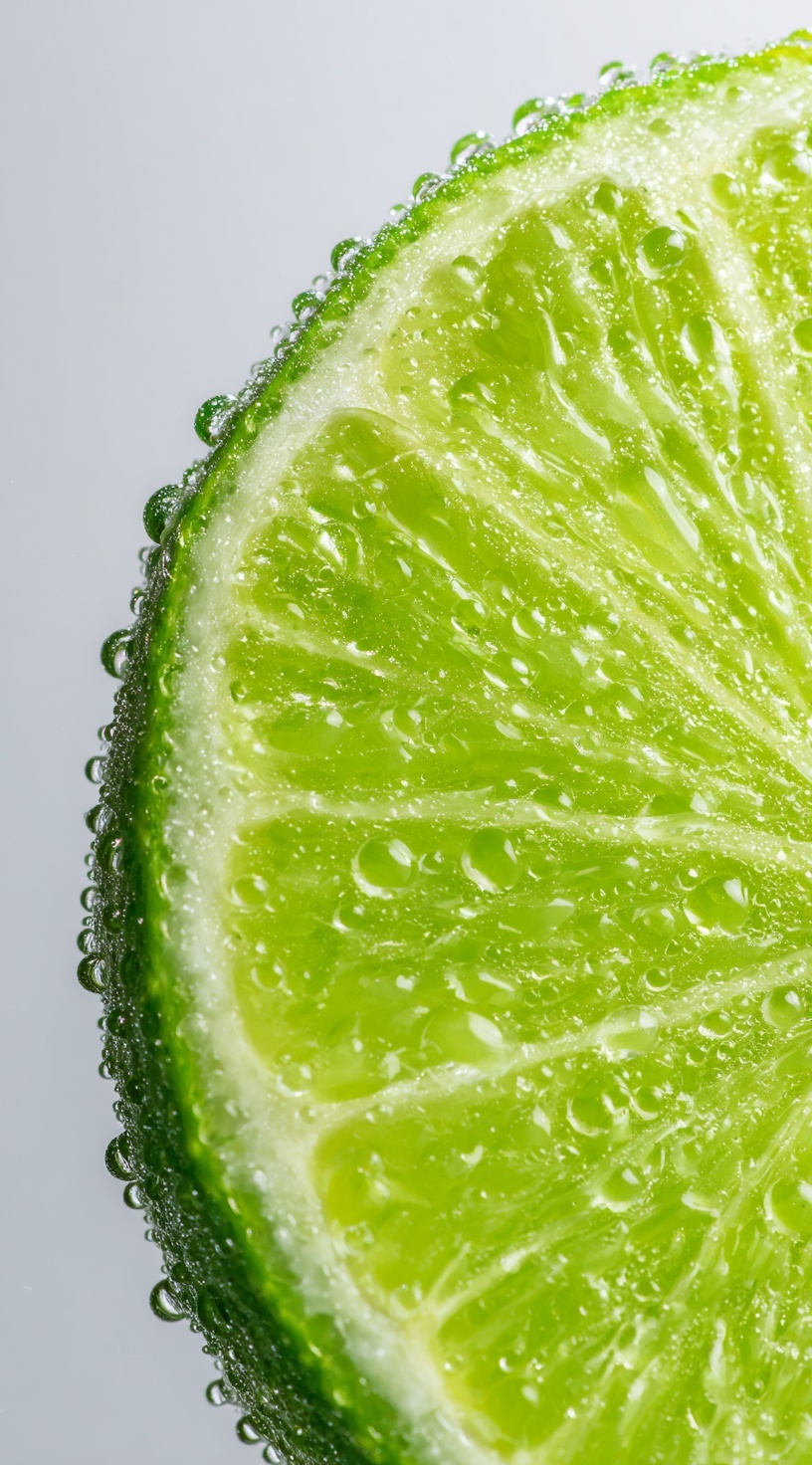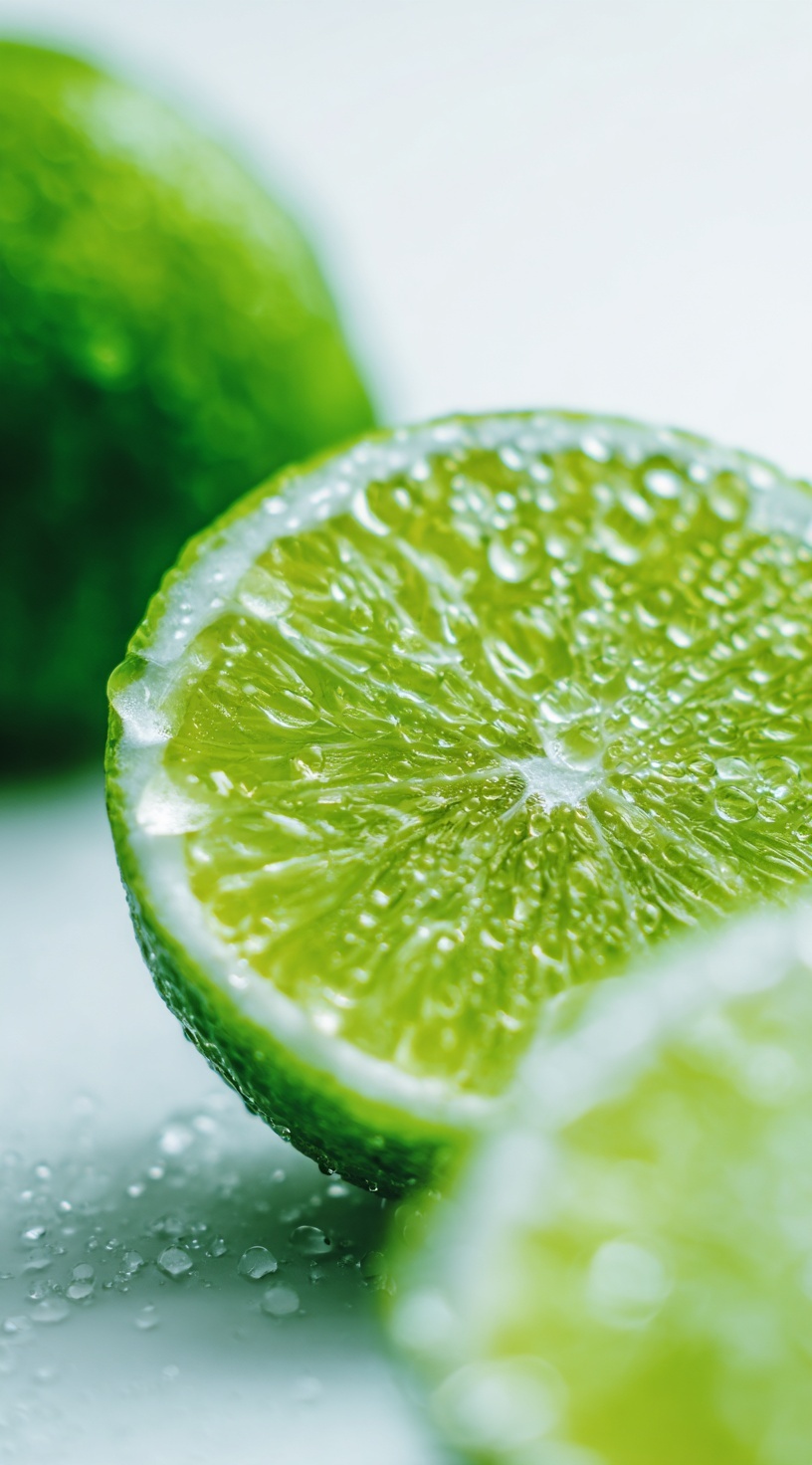 Студийная фотография дольки лайма с каплями воды на чистом белом фоне.