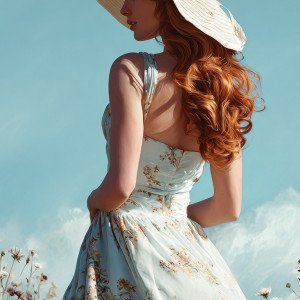Красивая женщина с каштановыми волосами стоит спиной к камере. На ней элегантное летнее платье и шляпа от солнца.