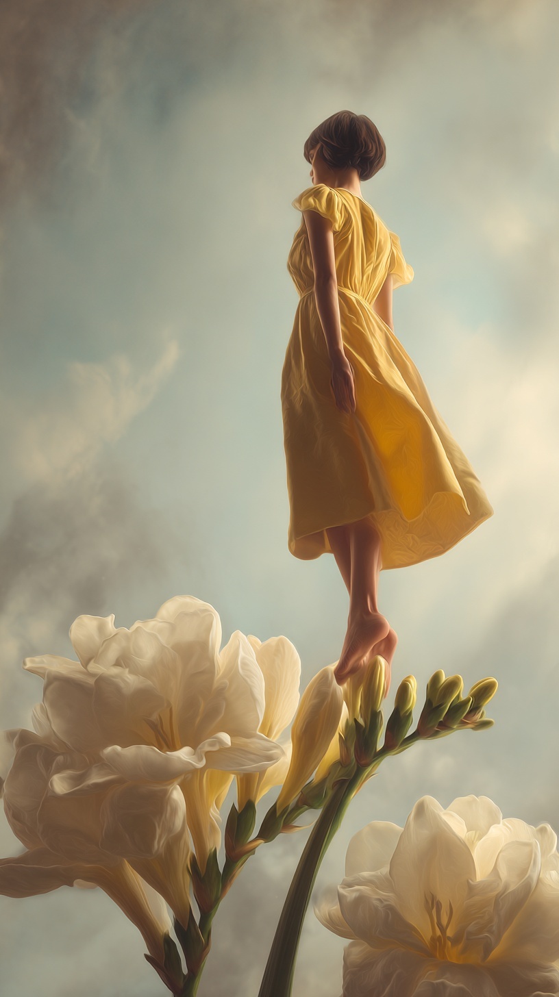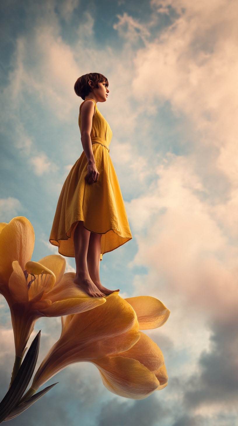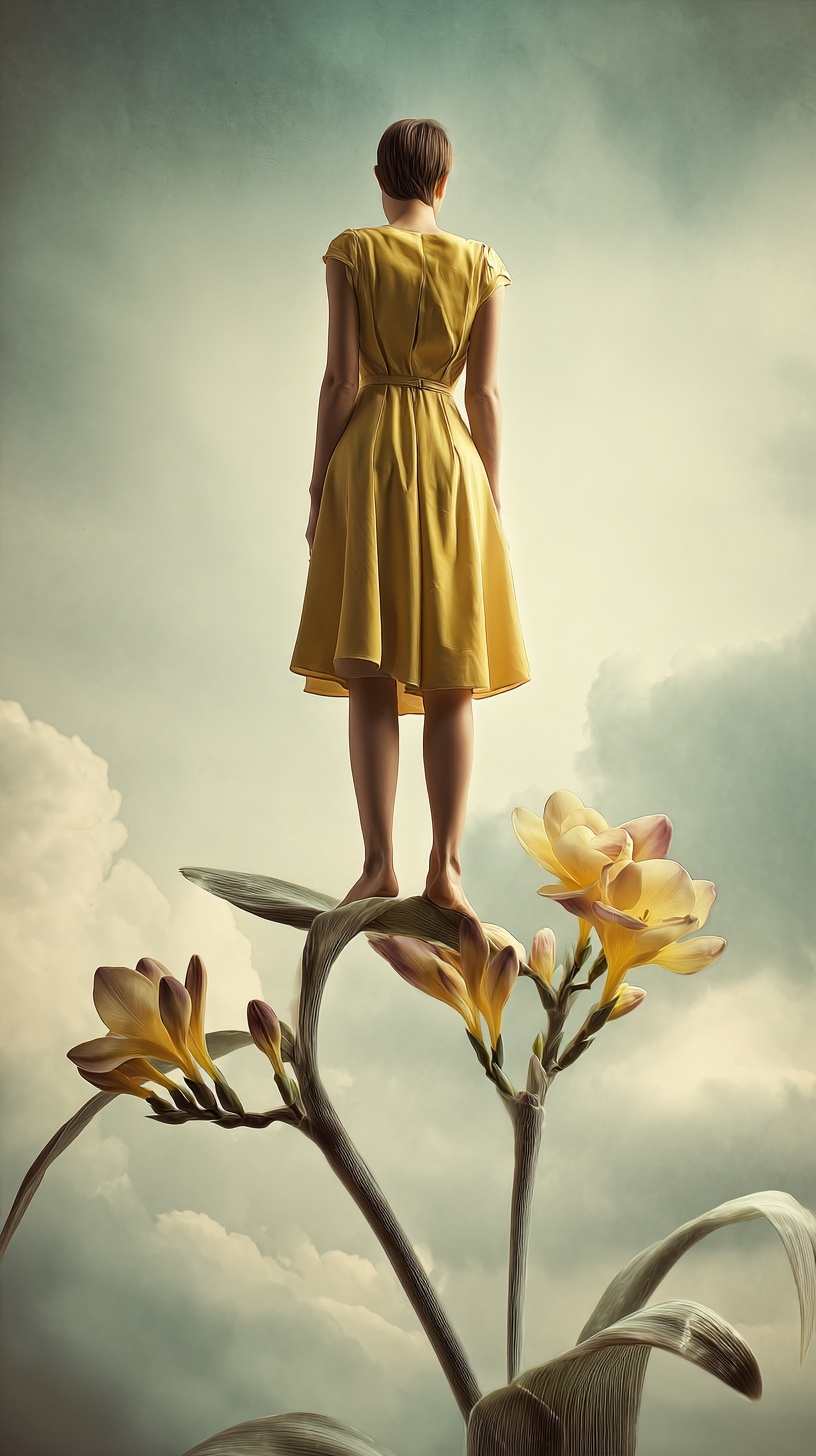 Сюрреалистичная фэшн-фотография: женщина в жёлтом платье стоит босиком на гигантском цветке фрезии.