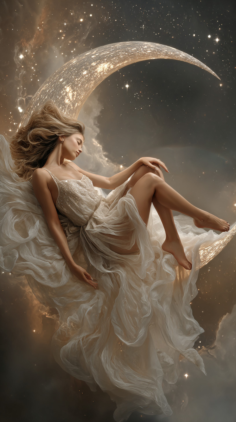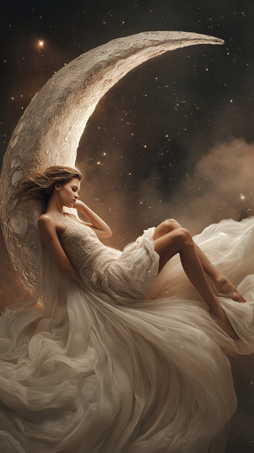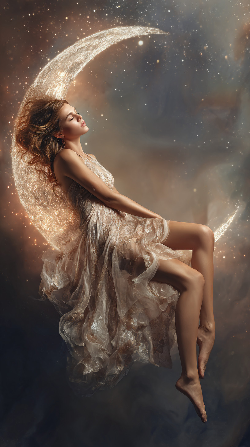 Женщина грациозно лежит на реалистичном полумесяце, парящем в космосе.