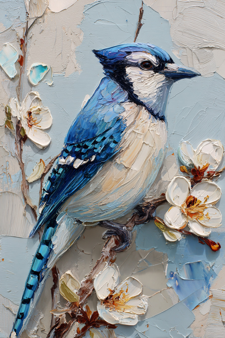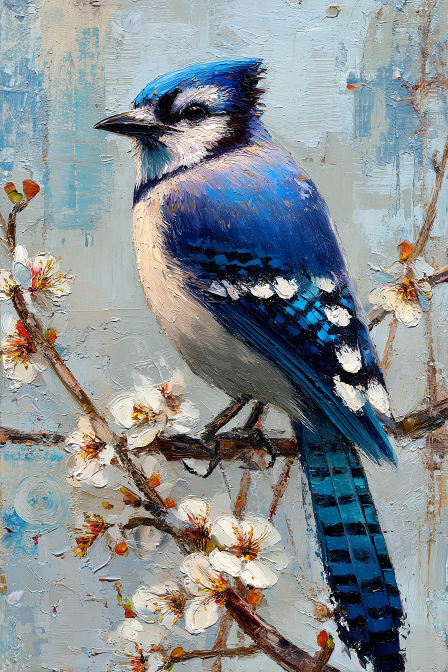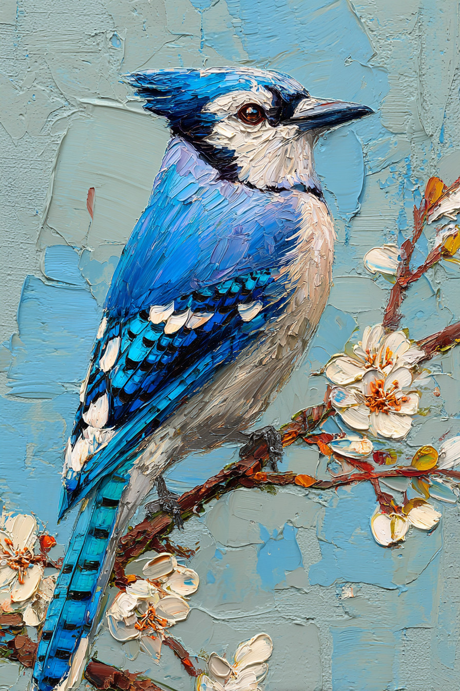 Яркая картина маслом: сойка сидит на цветущей ветке. Птица с голубым хохолком и замысловатым оперением смотрит прямо на зрителя.