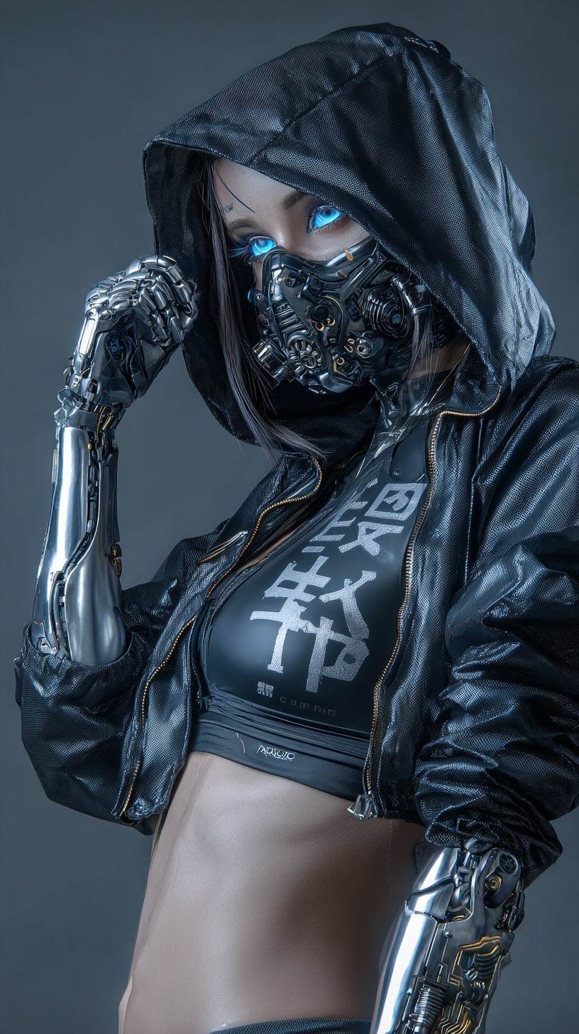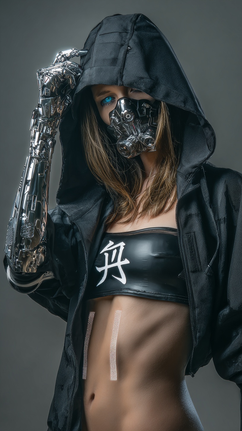 Стройная киборг-женщина, чья плоть сливается с хромом и матово-чёрными кибер-компонентами. Лицо скрыто маской-респиратором.