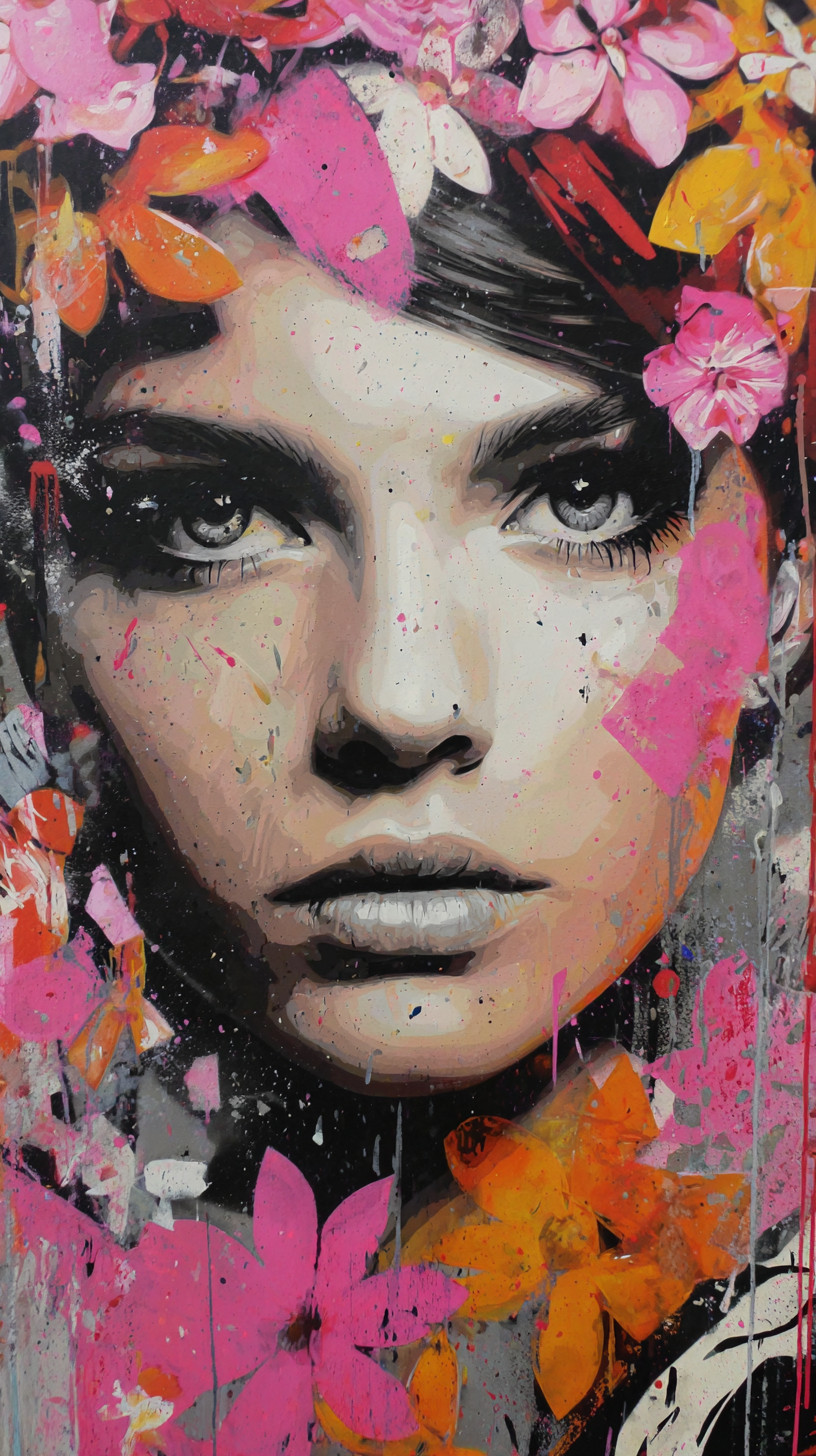 Граффити и стрит-арт с изображением красивой женщины, окружённой цветами и яркими розовыми брызгами краски.