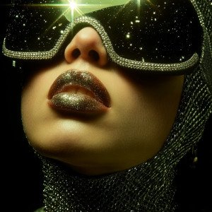 Вспышечное освещение, чёрный фон с редкими звёздами, ультрачёткие украшения.