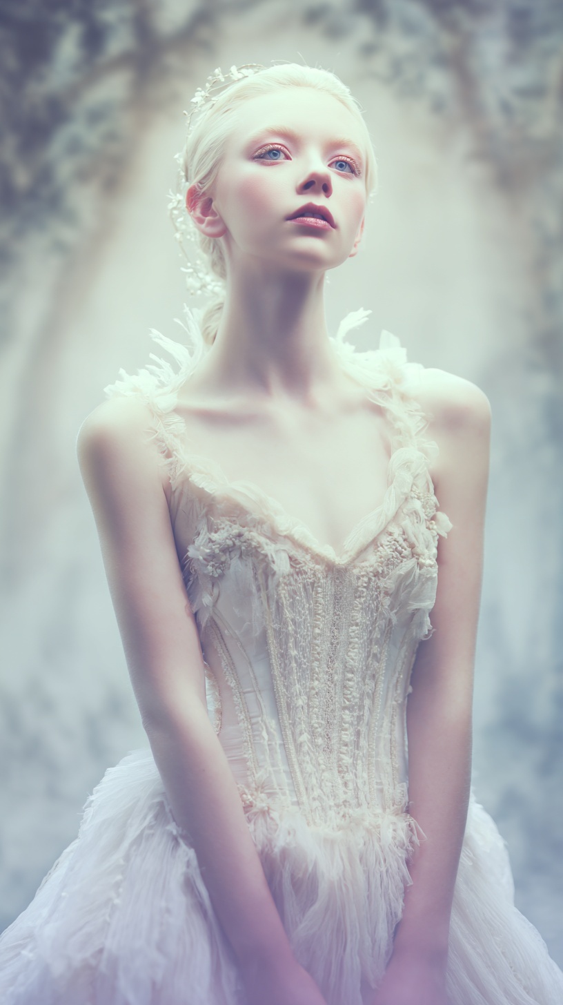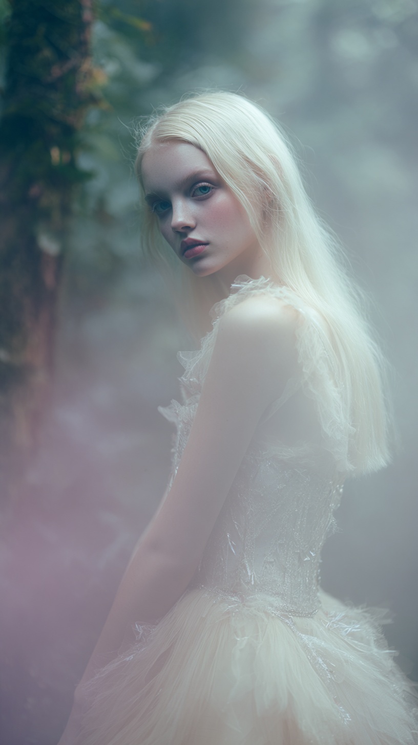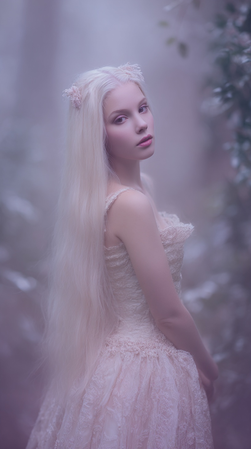 Эльфийская красота, мягкий туман в волшебном лесу, пастельные тона. Стиль Сары Мун и Паоло Роверси.