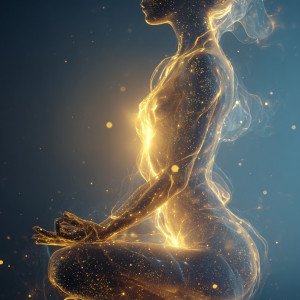 Сюрреалистичный женский силуэт во весь рост, сотканный из света. Фигура слегка парит над землей в позе медитации.
