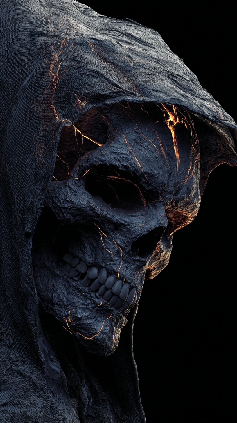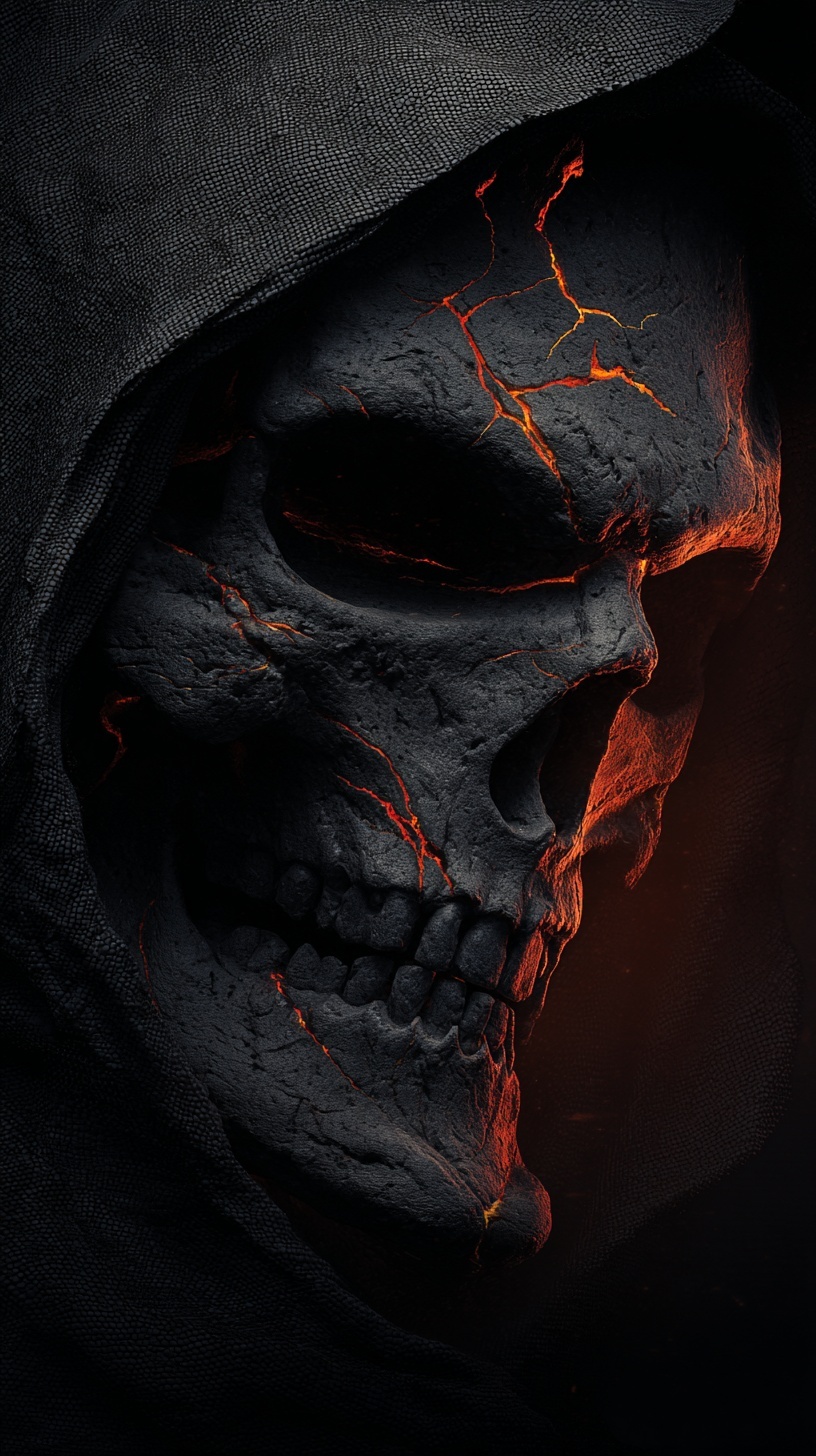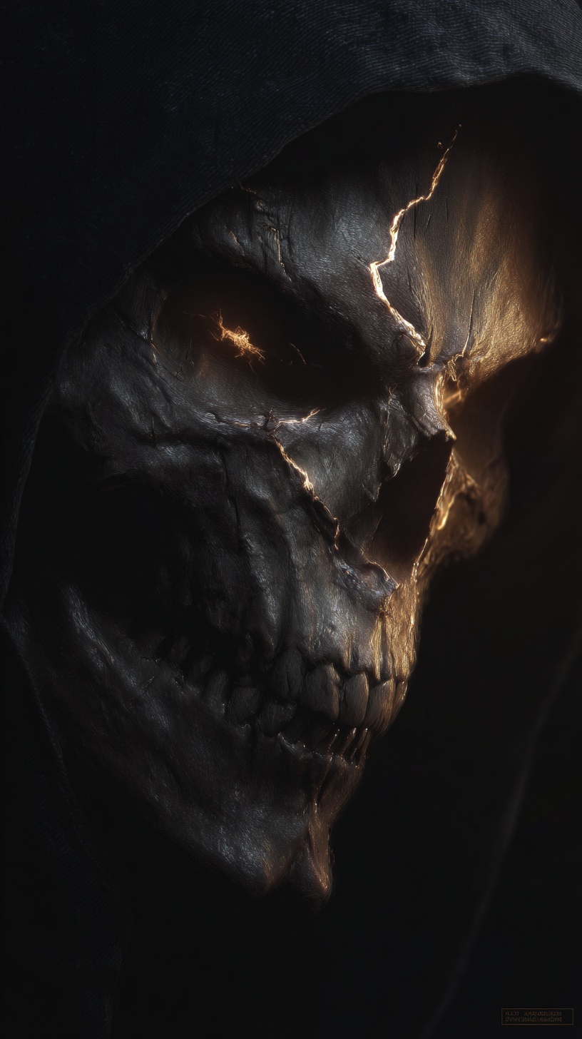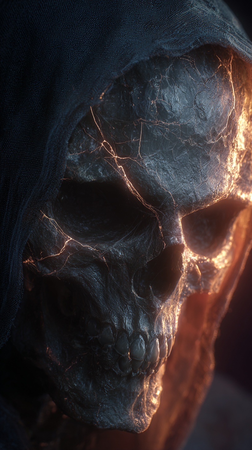 Череп в капюшоне с светящимися трещинами и глазами.