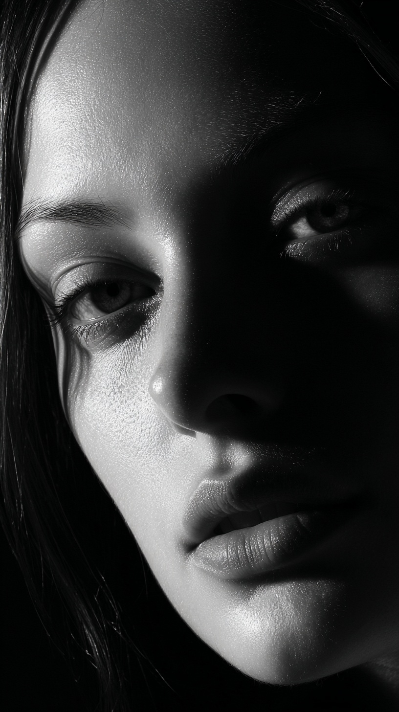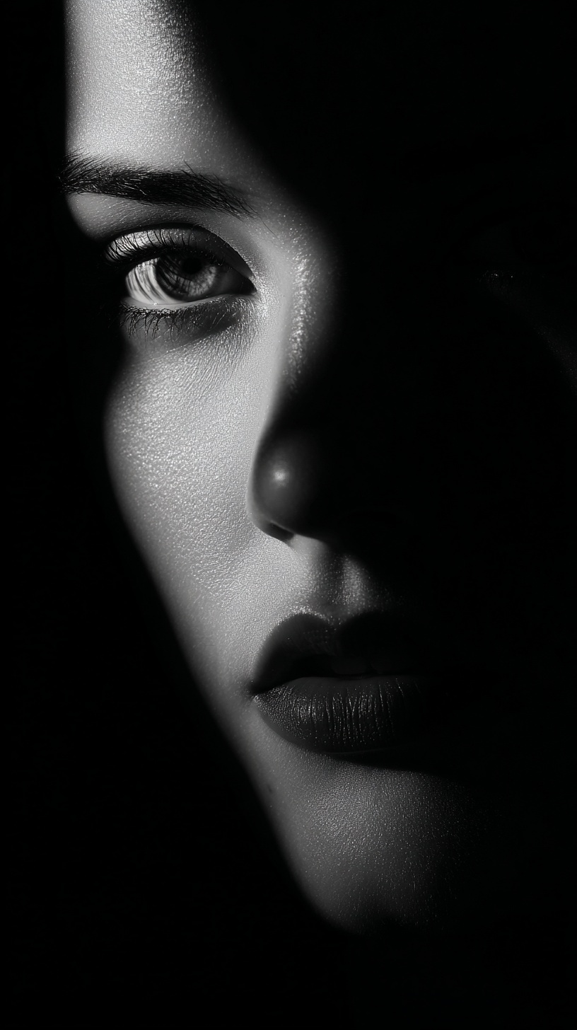 Крупный план лица женщины, освещённый лунным светом. Чёрно-белое изображение с тенями, подчёркивающими черты лица, глаза и губы.