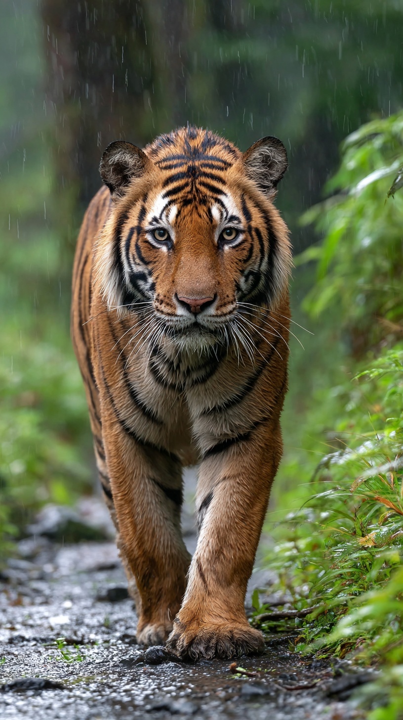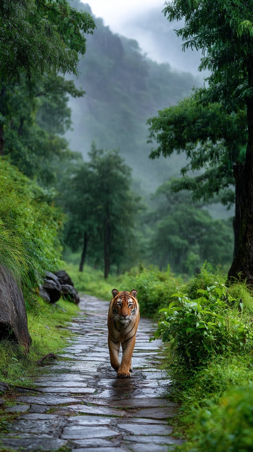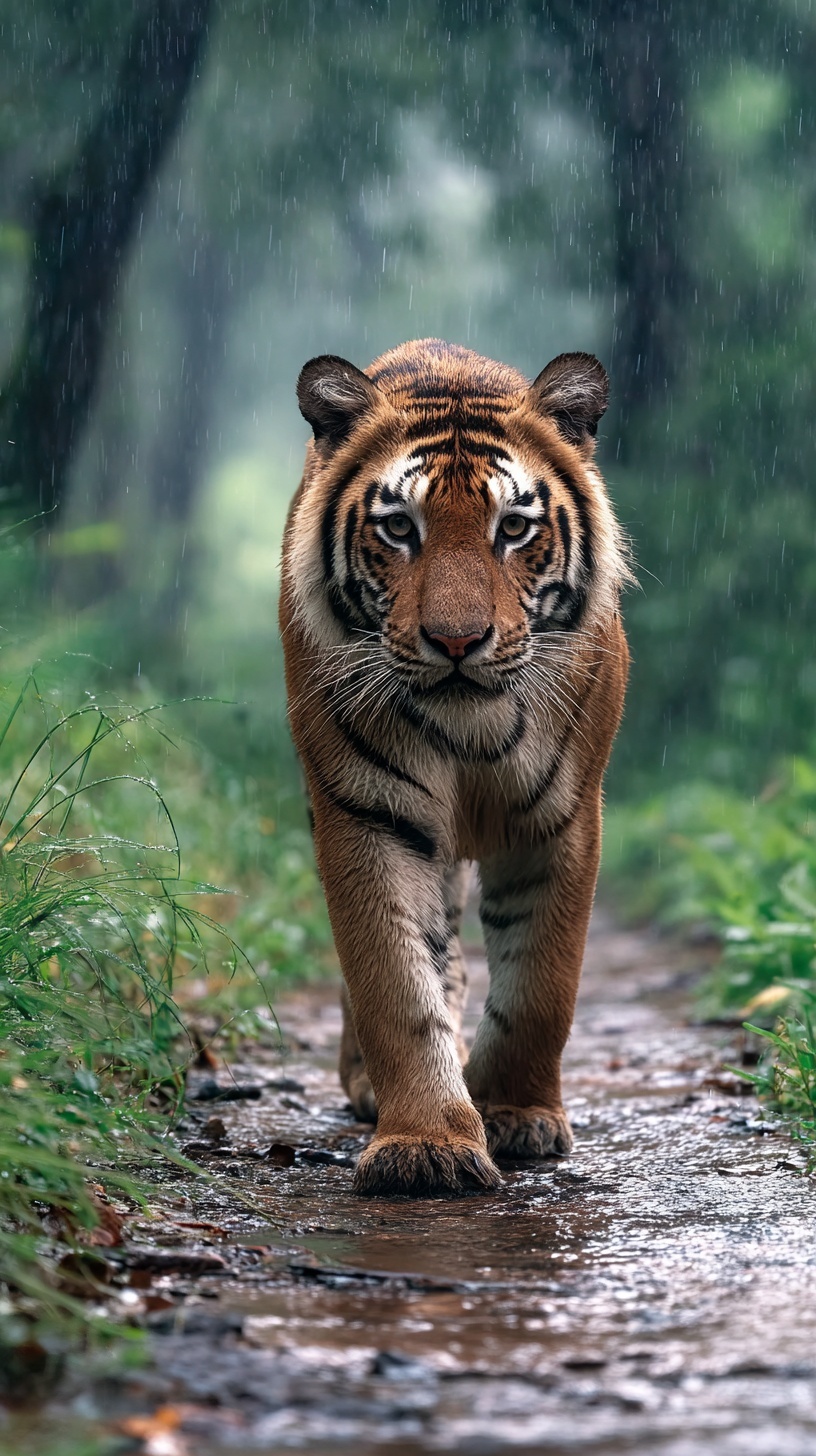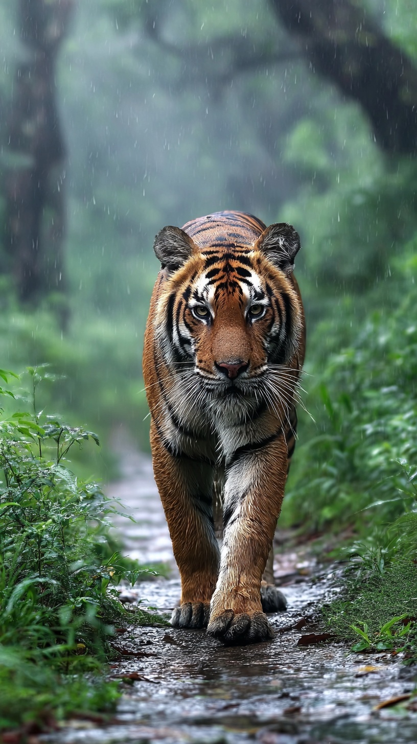 Фотография тигра, идущего по тропе в джунглях Индии во время дождя.
