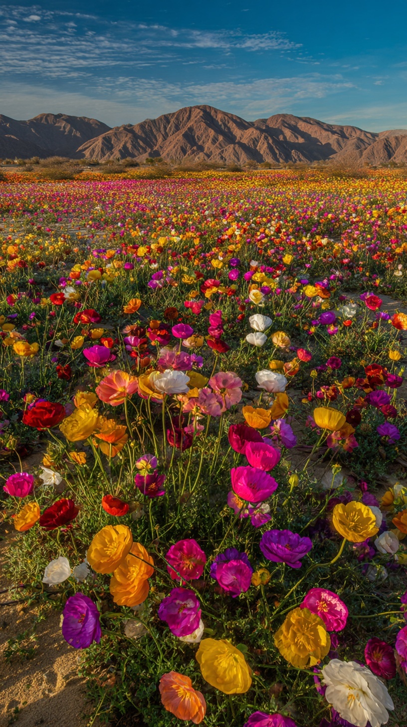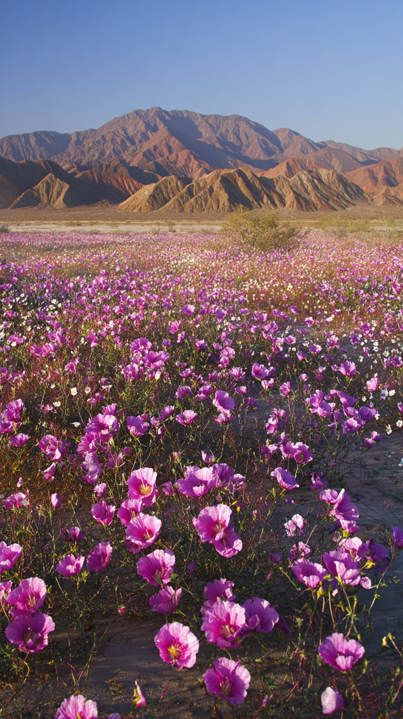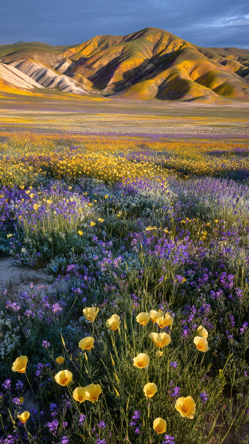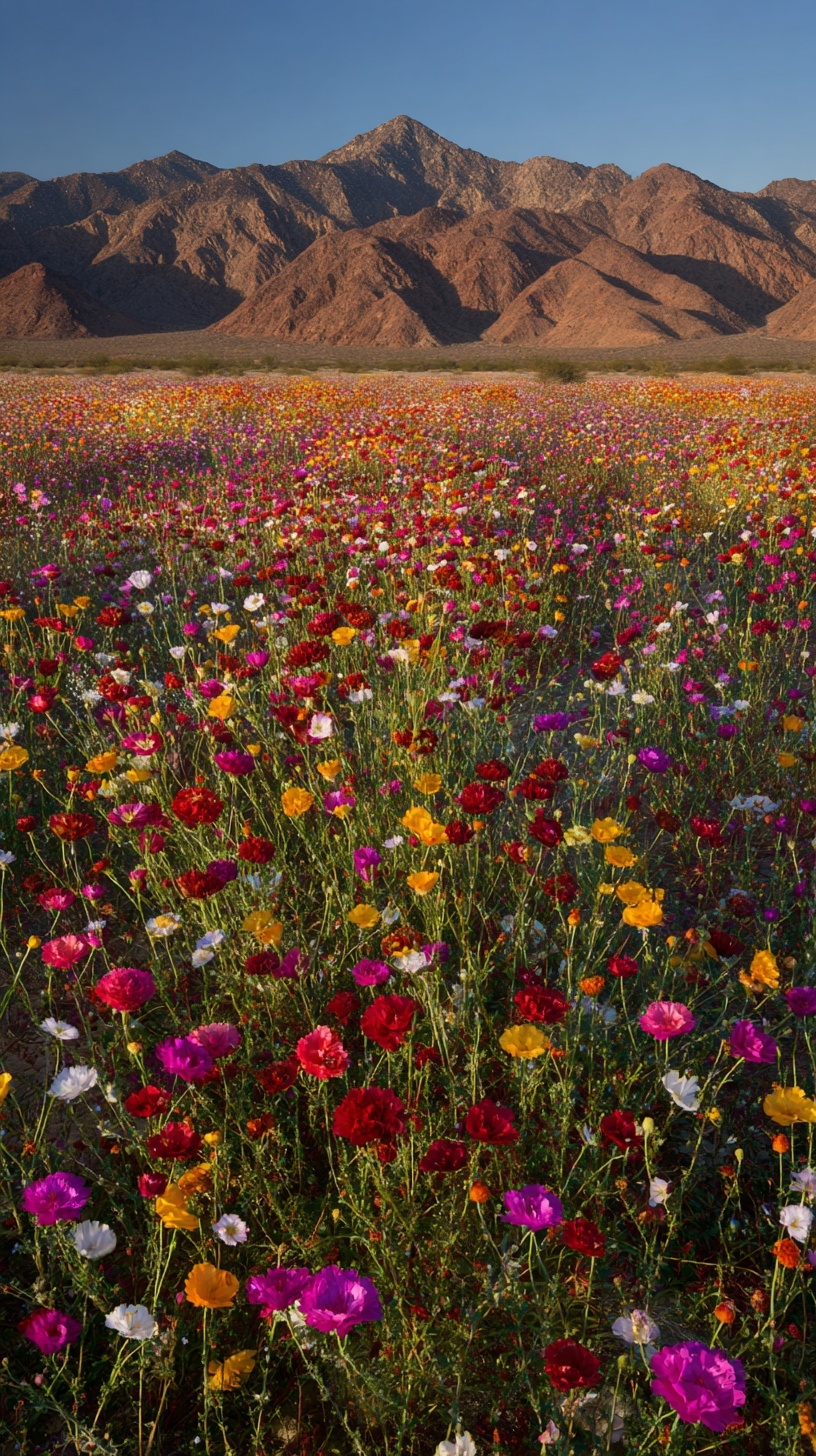 Бескрайнее поле полевых цветов под утренним солнцем. Яркие цветы, покрытые росой, на фоне гор.