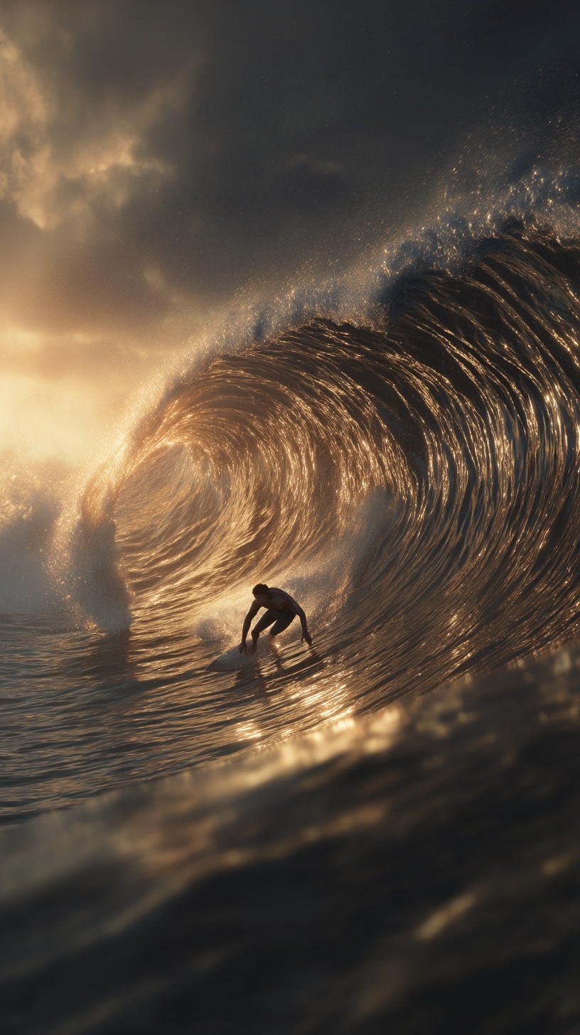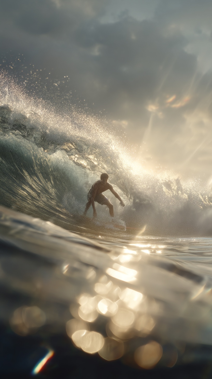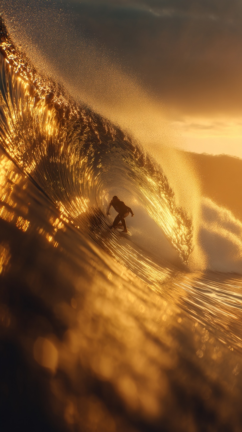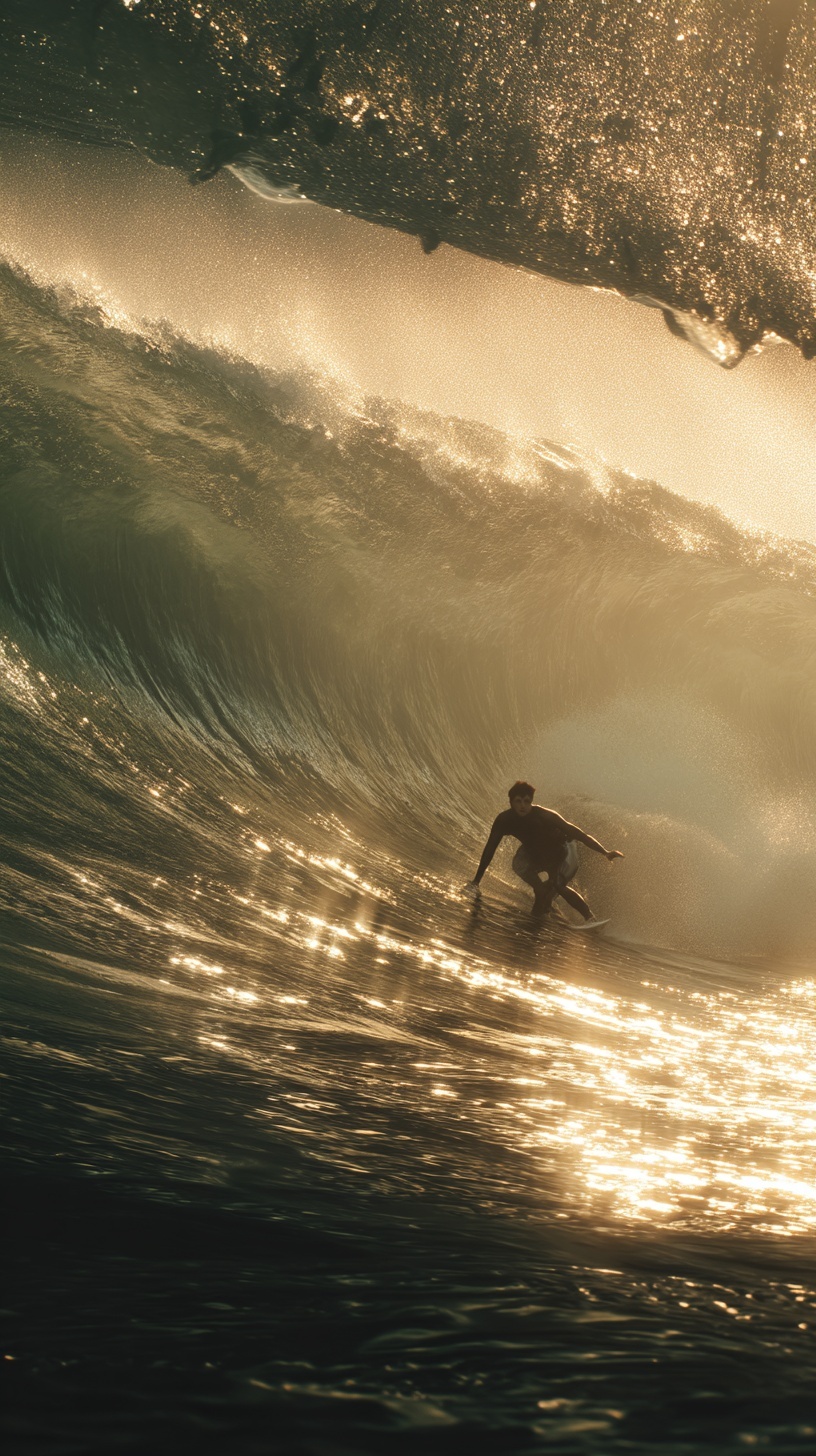 Фотография серфера на линии мощной волны. Съемка с нижнего ракурса, утреннее солнце пробивается сквозь горизонт, золотые лучи подсвечивают брызги и морскую дымку.