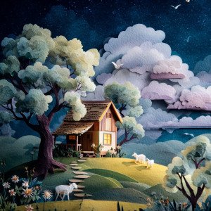 Многослойное искусство бумажной вырезки: уютный домик на холме под звёздным небом.
