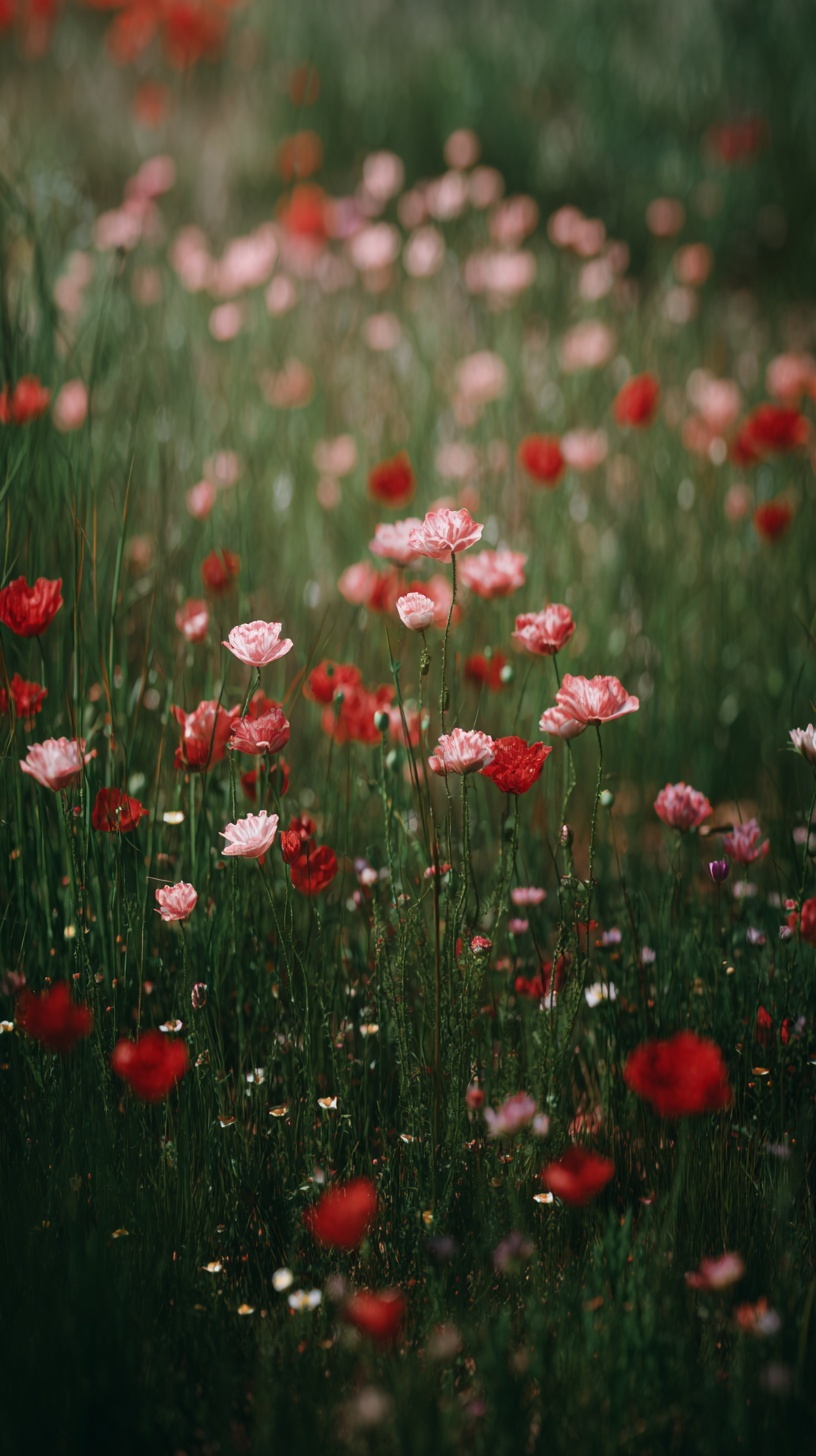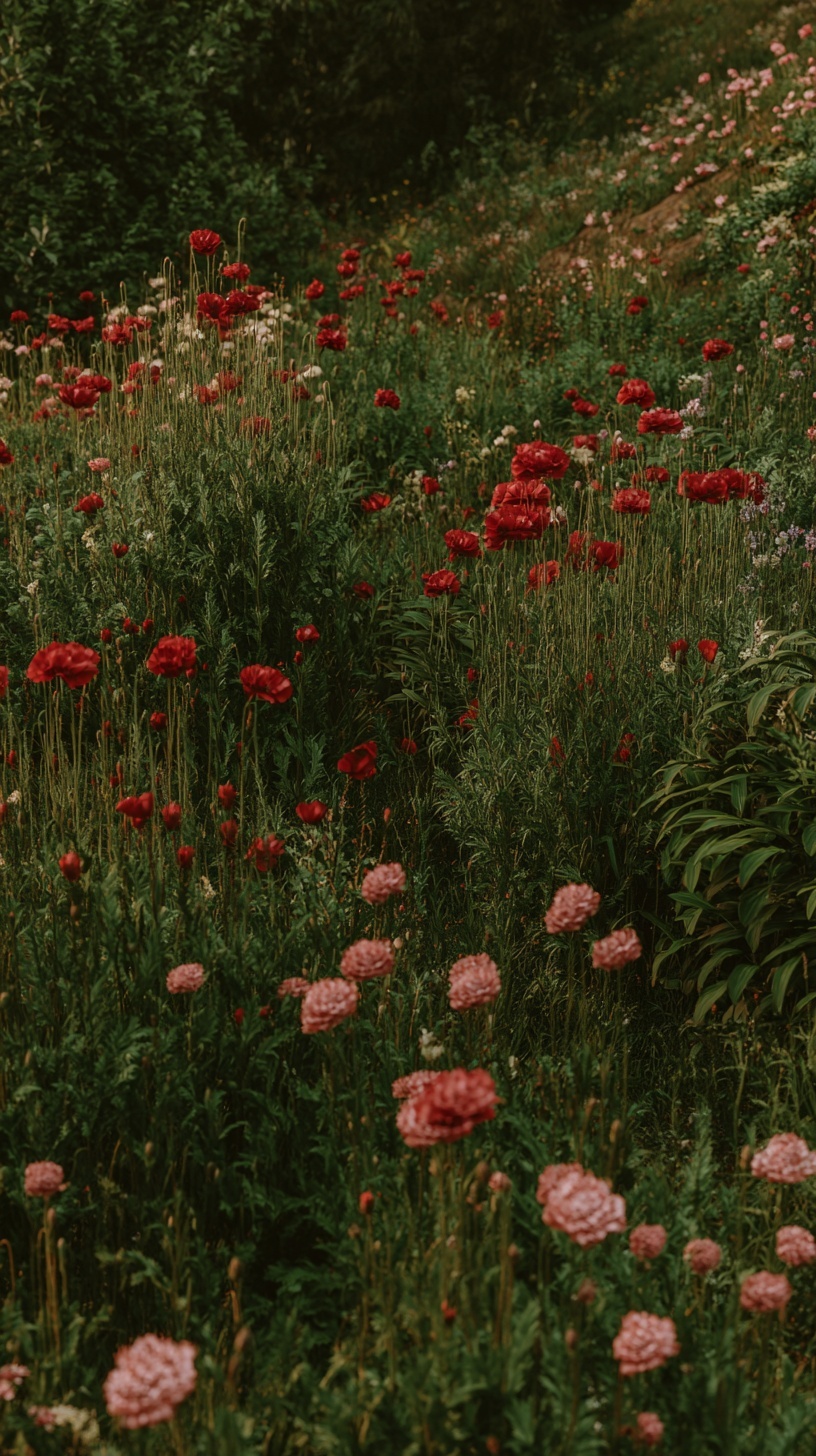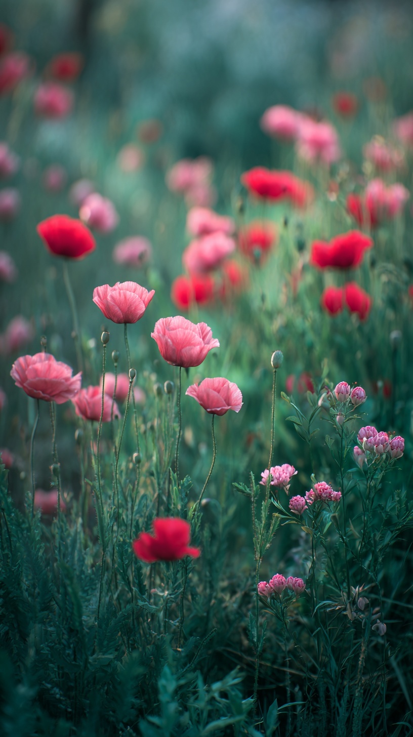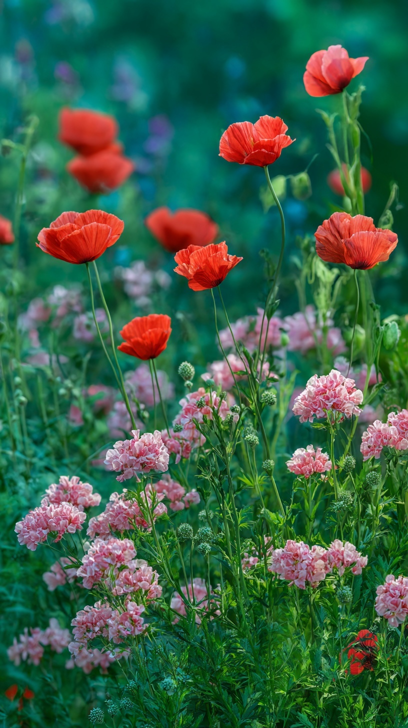 Поле с изумрудной зеленью и алыми маками в мягком вечернем свете.