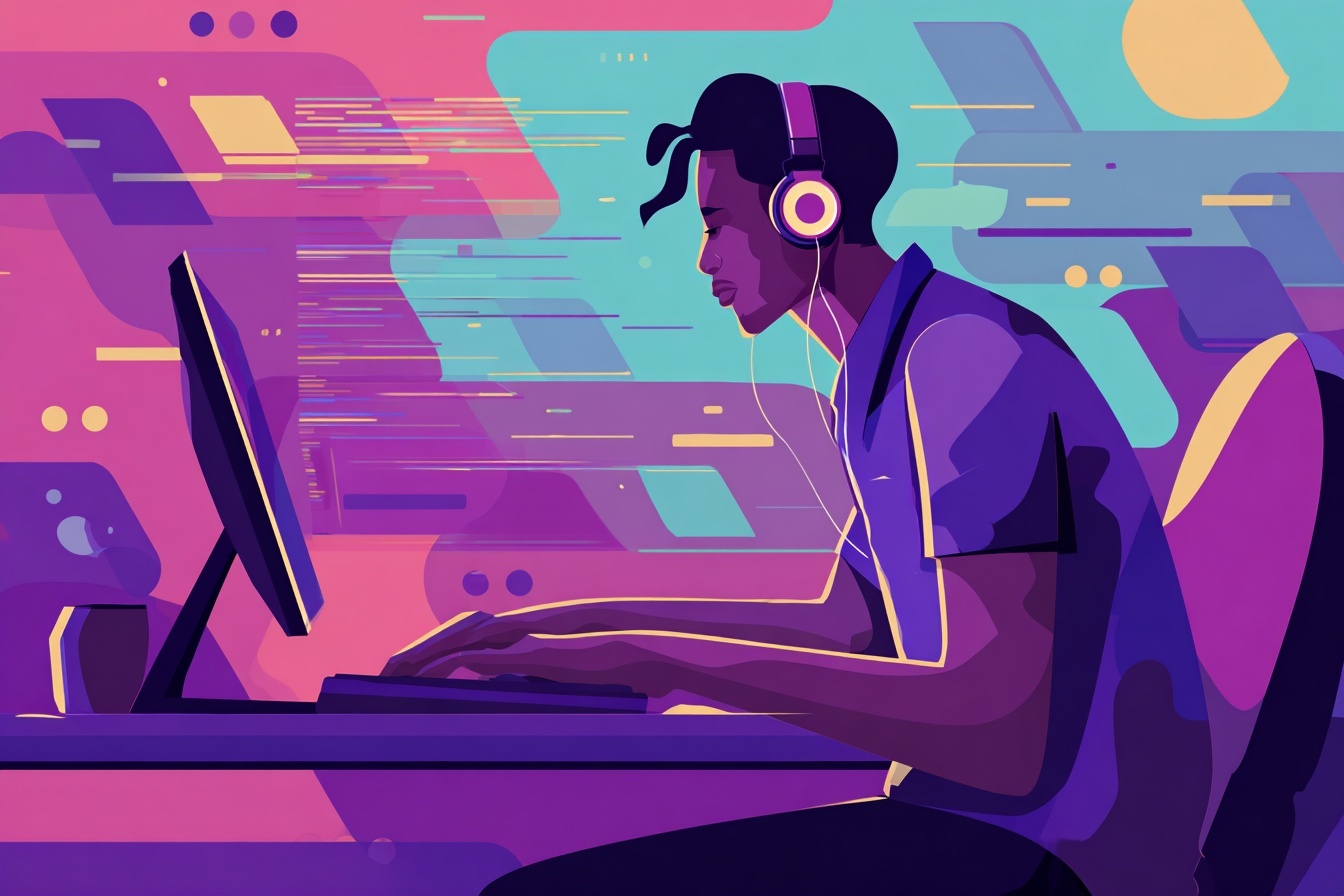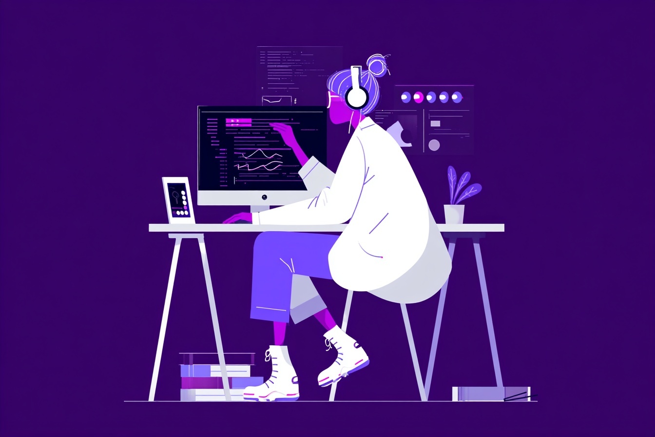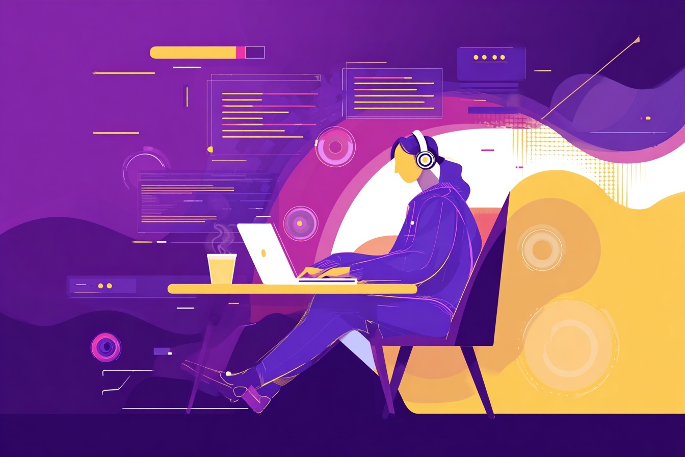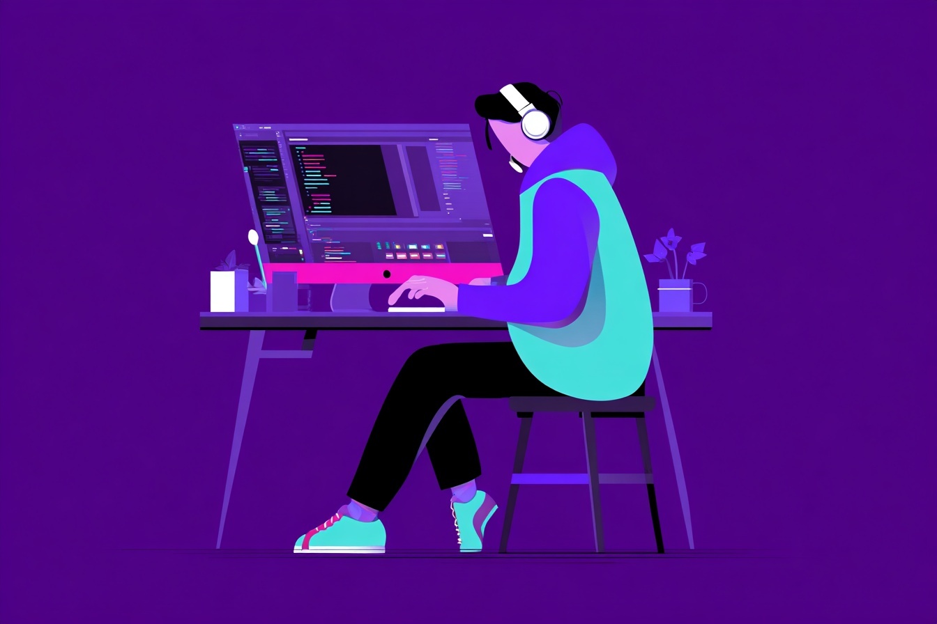 Векторная иллюстрация в плоском стиле: разработчик пишет код в наушниках. Минималистичные геометрические формы, чистые линии и фиолетовые акценты.