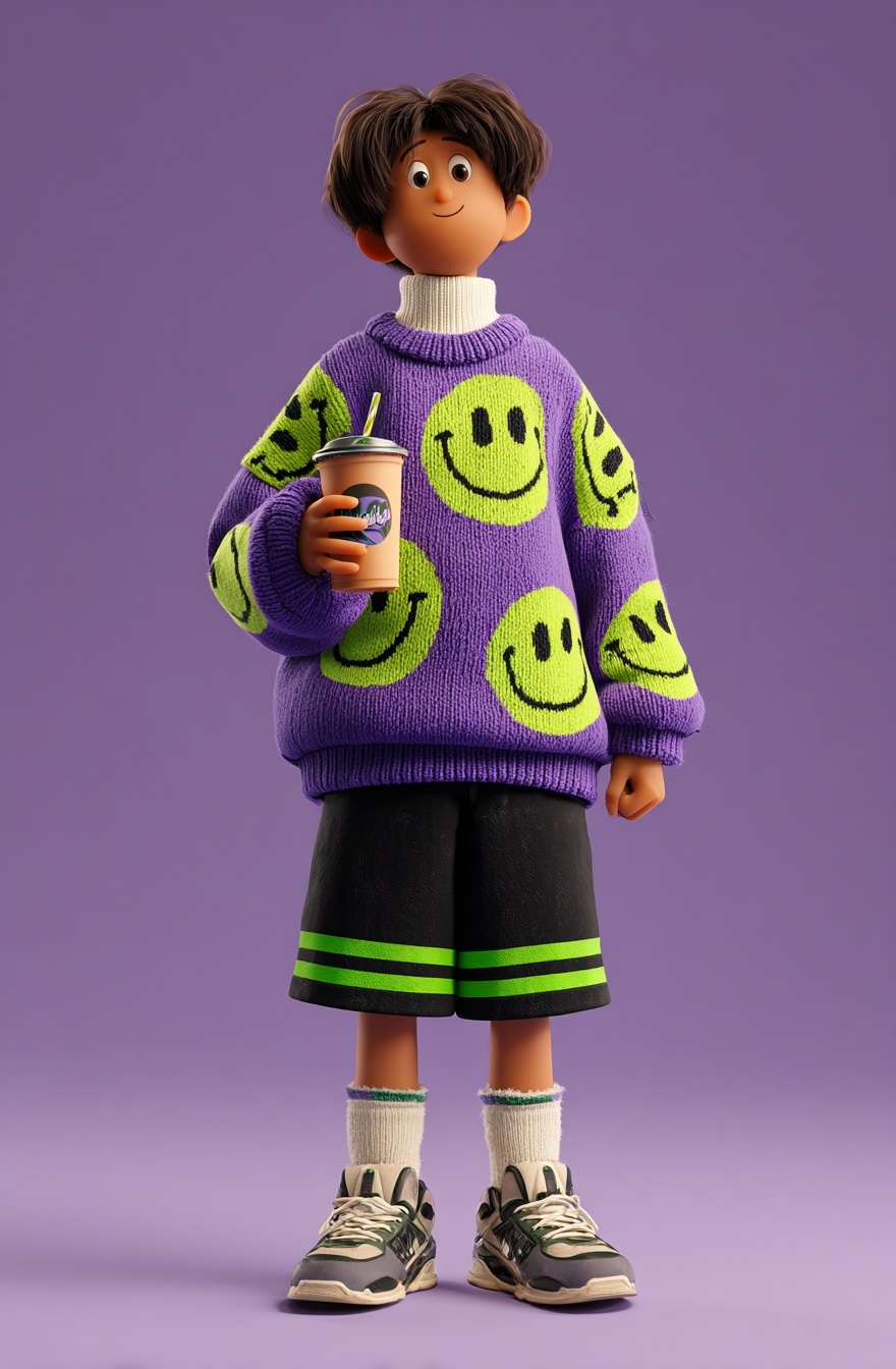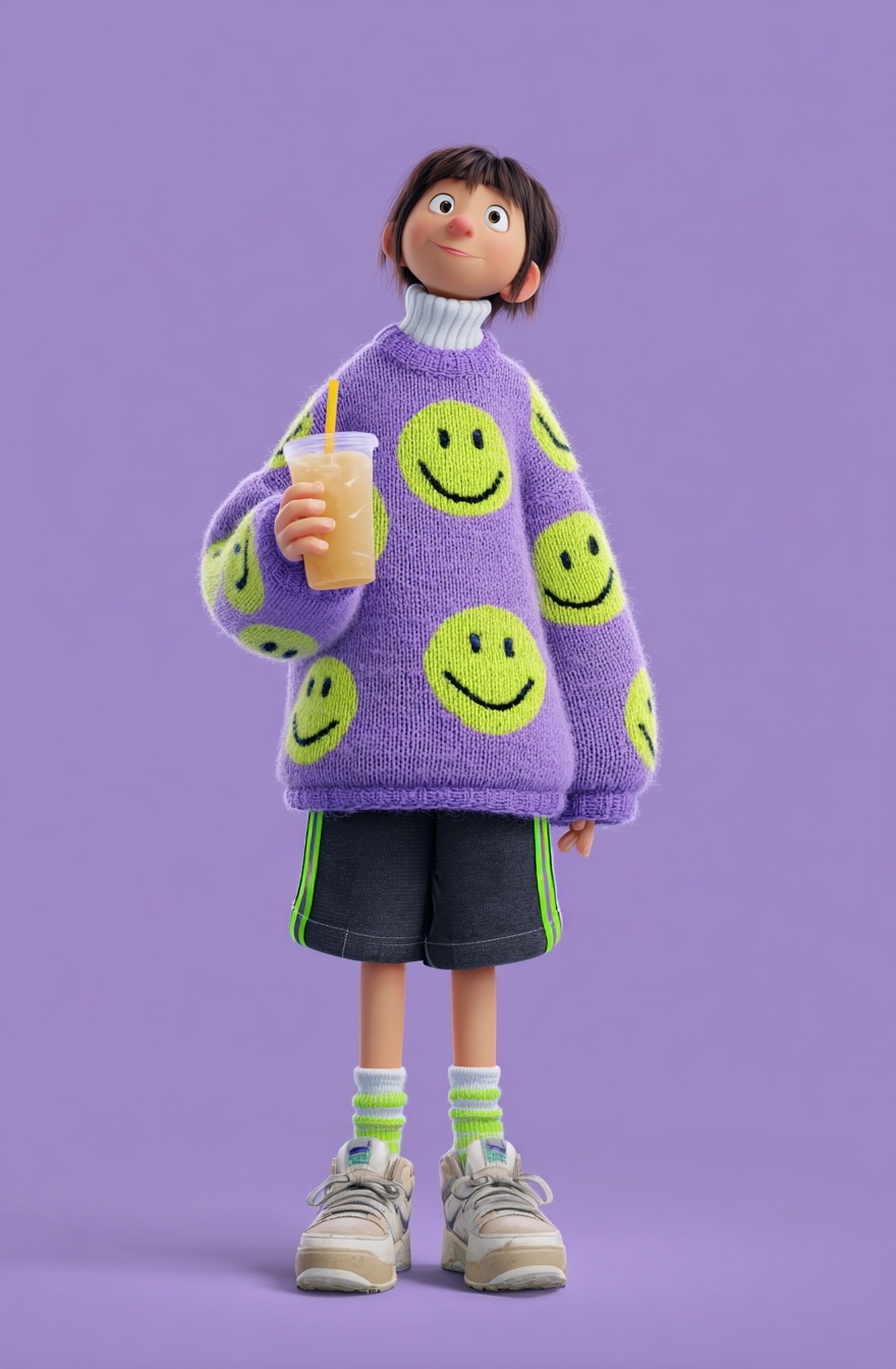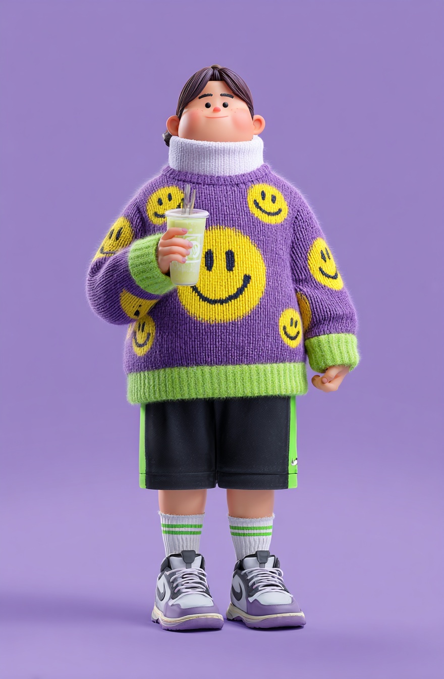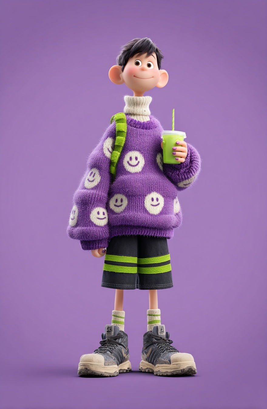 3D-персонаж в стиле Pixar и Disney в фиолетовом свитере с смайлами. Полный рост, фиолетовый фон, анимационный стиль.