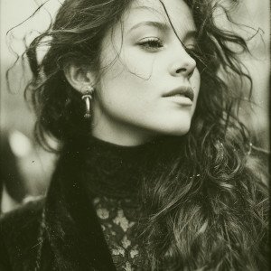 Порыв ветра запутывает длинные волосы в танце случайных линий, создавая живую картину в духе черно-белых пленочных фото Нью-Йоркской школы.