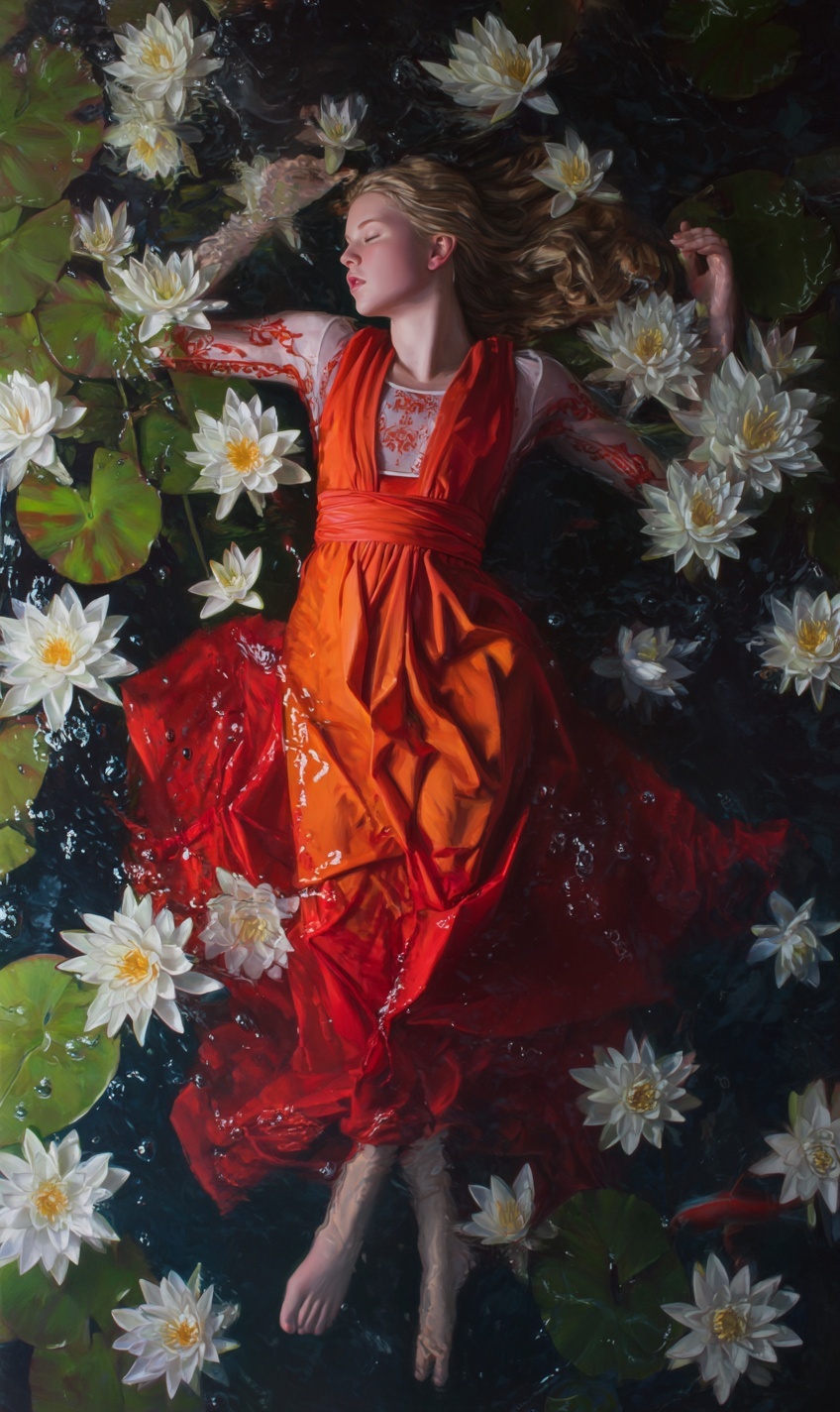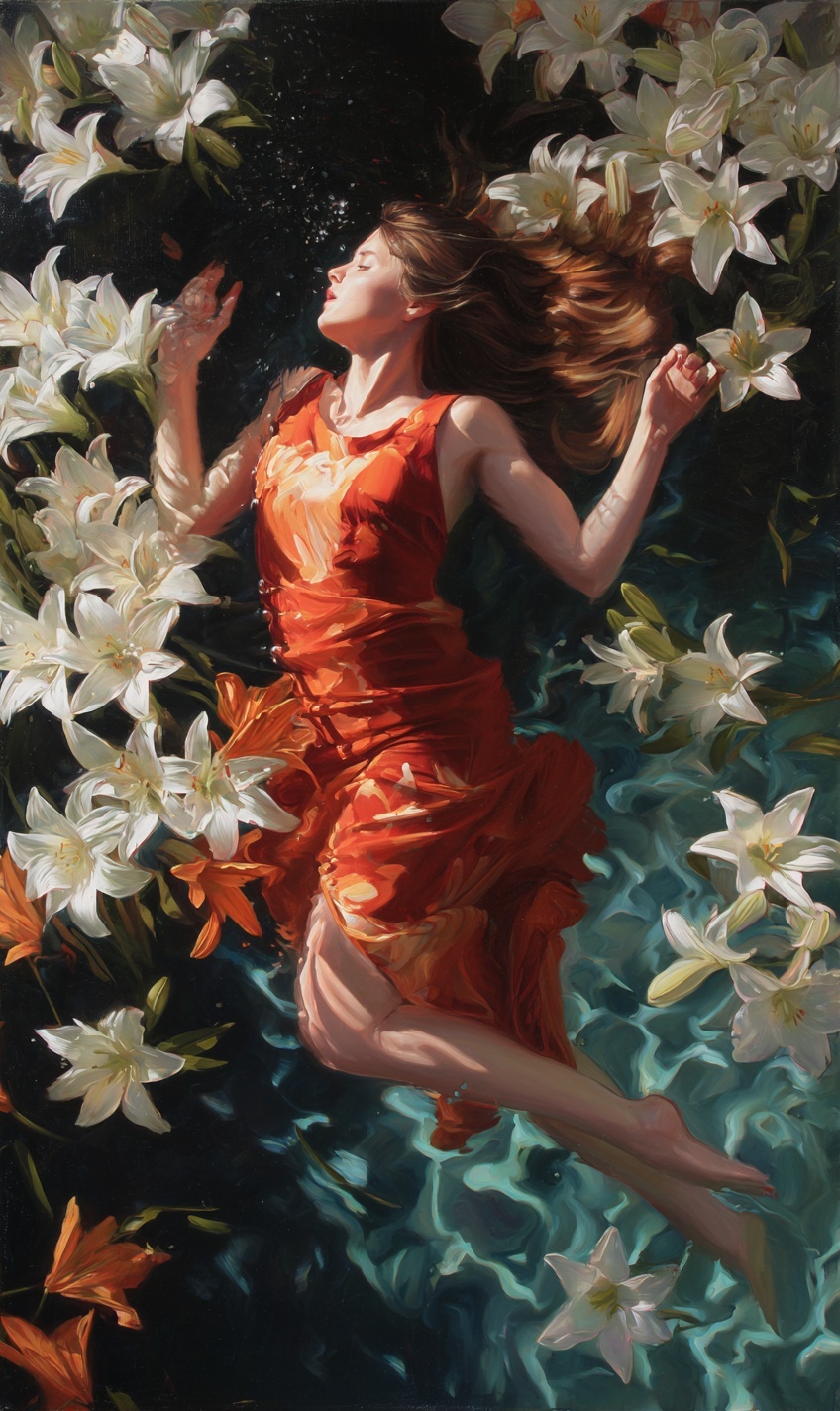 Картина маслом с завораживающей женщиной, словно парящей в воде в красно-оранжевом платье, окружённой белыми лилиями.