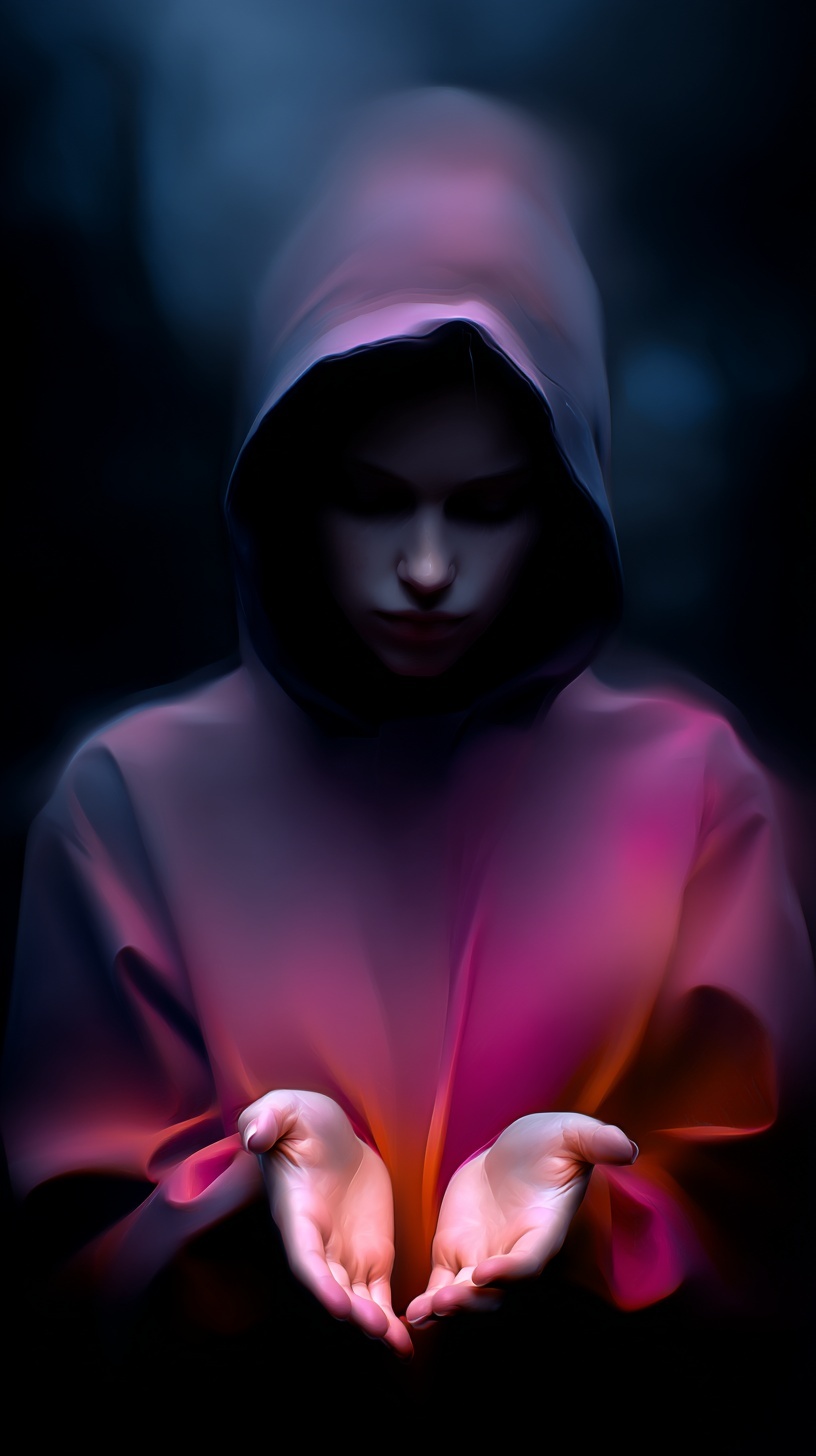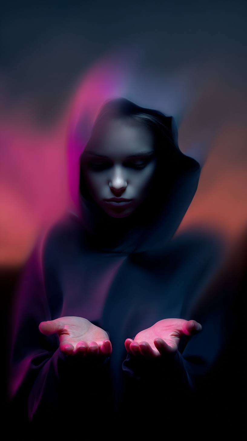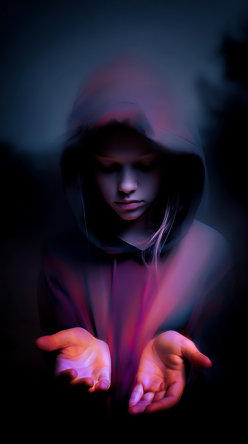 Девушка в капюшоне смотрит вниз на свои раскрытые ладони. Ночь, малая глубина резкости, приглушённые цвета, мягкий объёмный свет.