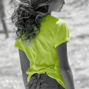 Фотография с выборочной окраской, вид сзади на девушку. Её кожа, волосы и размытый пляжный фон — в чёрно-белой гамме, а яркая неоновая футболка и джинсовые шорты остаются цветными.