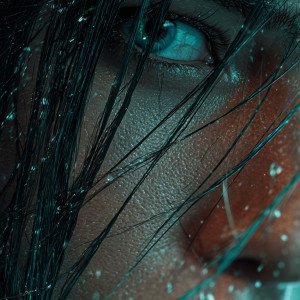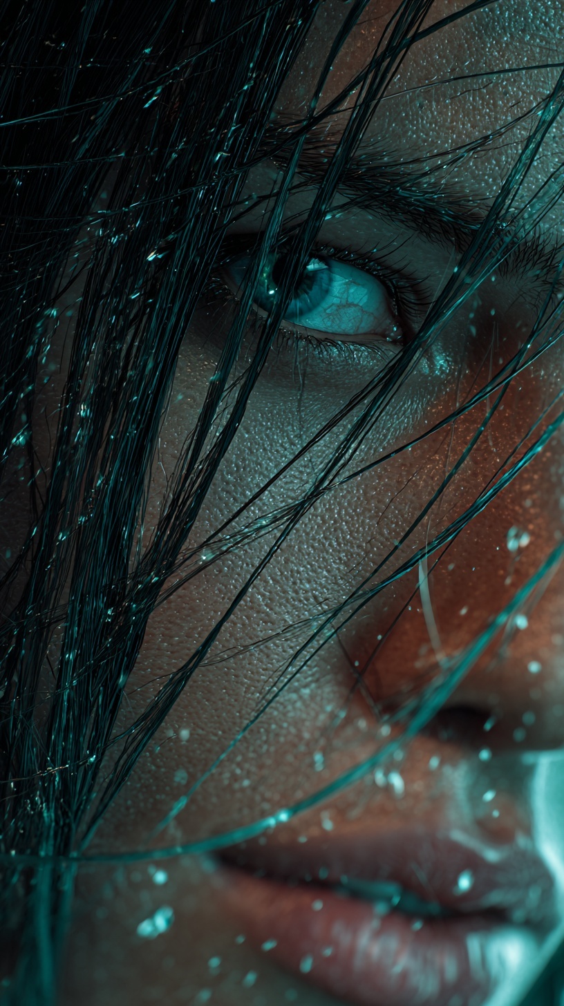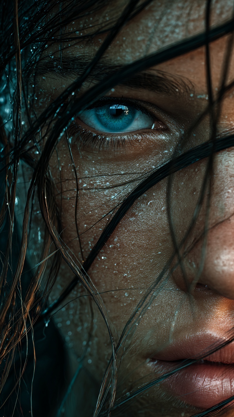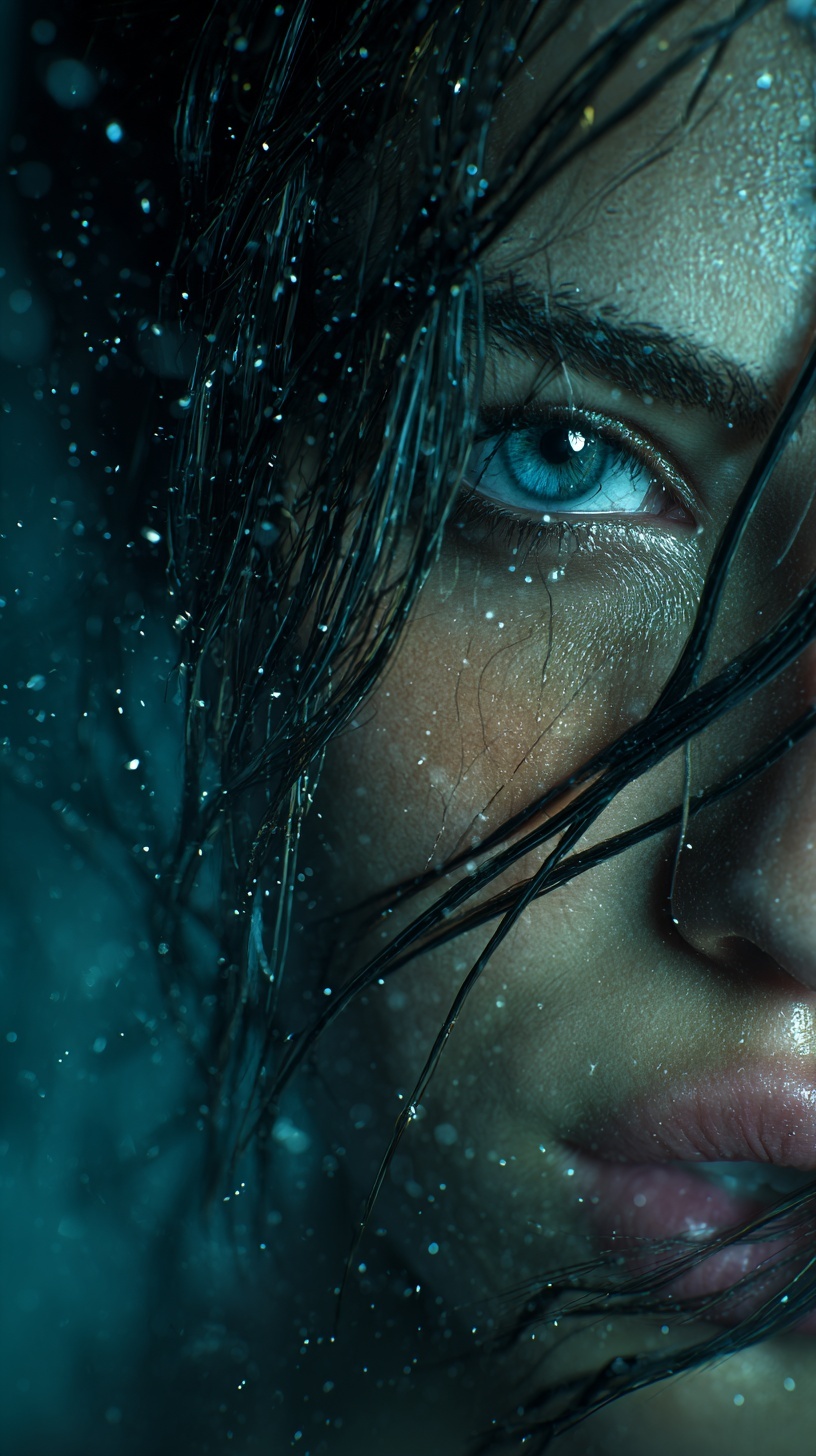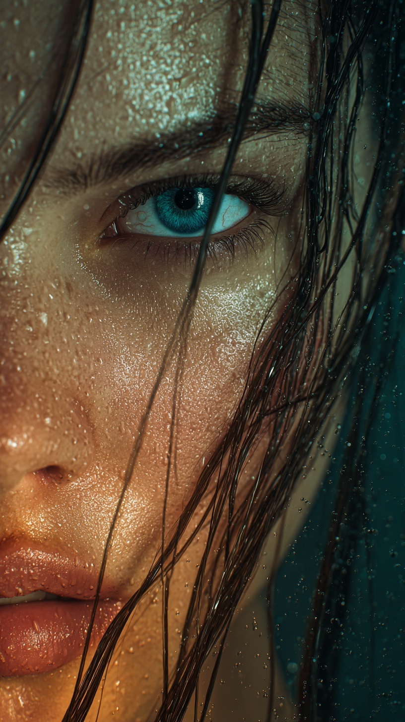Кинематографичный портрет молодой Адрианы Лимы: острый фокус, мокрые пряди волос, капли воды и частицы в воздухе.