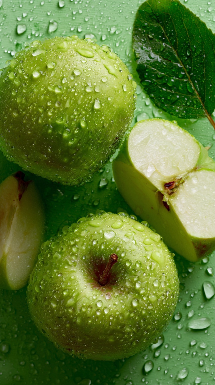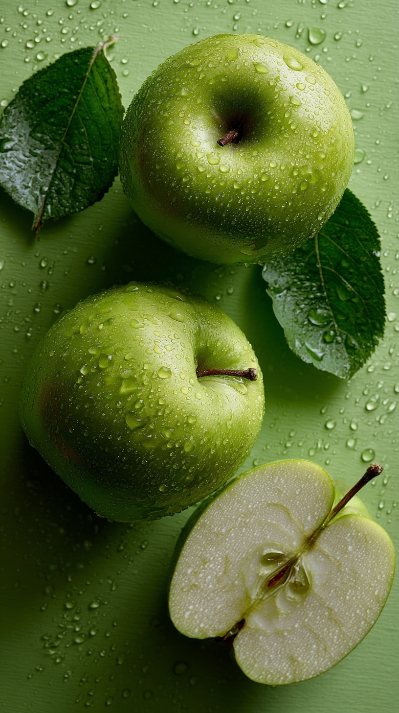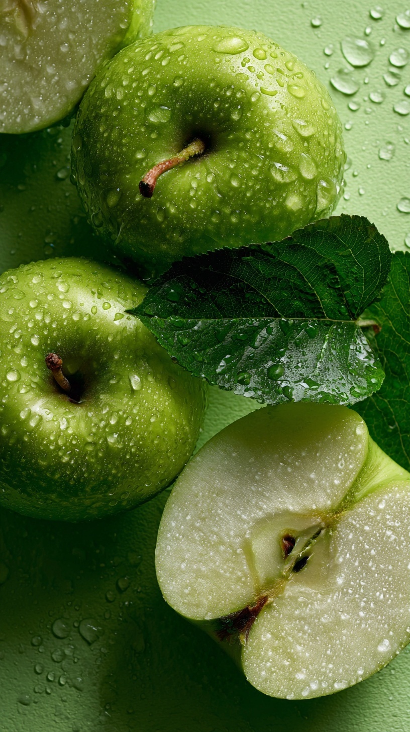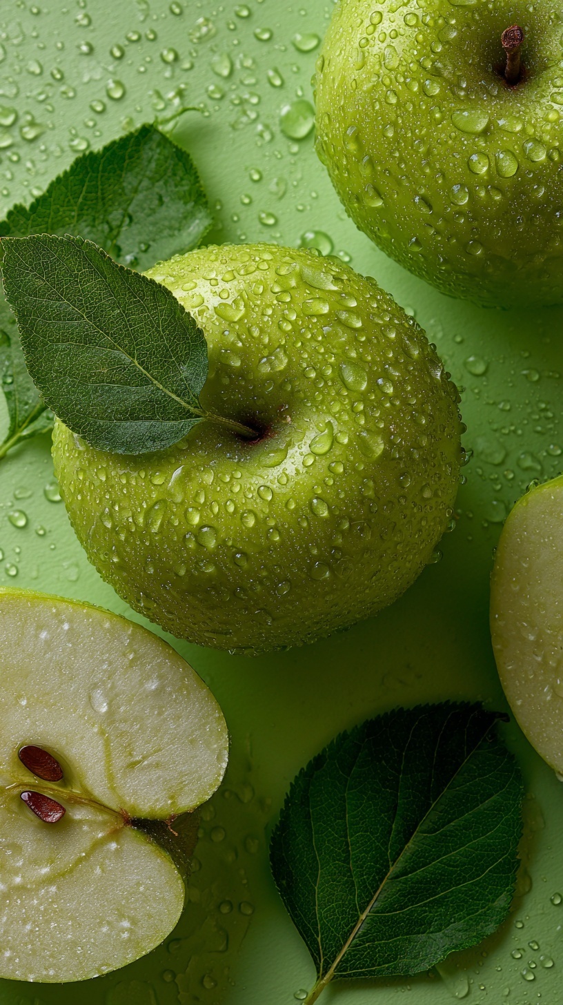 Композиция сверху: целое зелёное яблоко с листом, половинка и долька на салатовом фоне. Капли воды подчёркивают свежесть фруктов