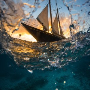 Вид снизу на деревянную яхту с парусами сквозь толщу воды. Закатное освещение, стиль фотографа Зака Нояля.