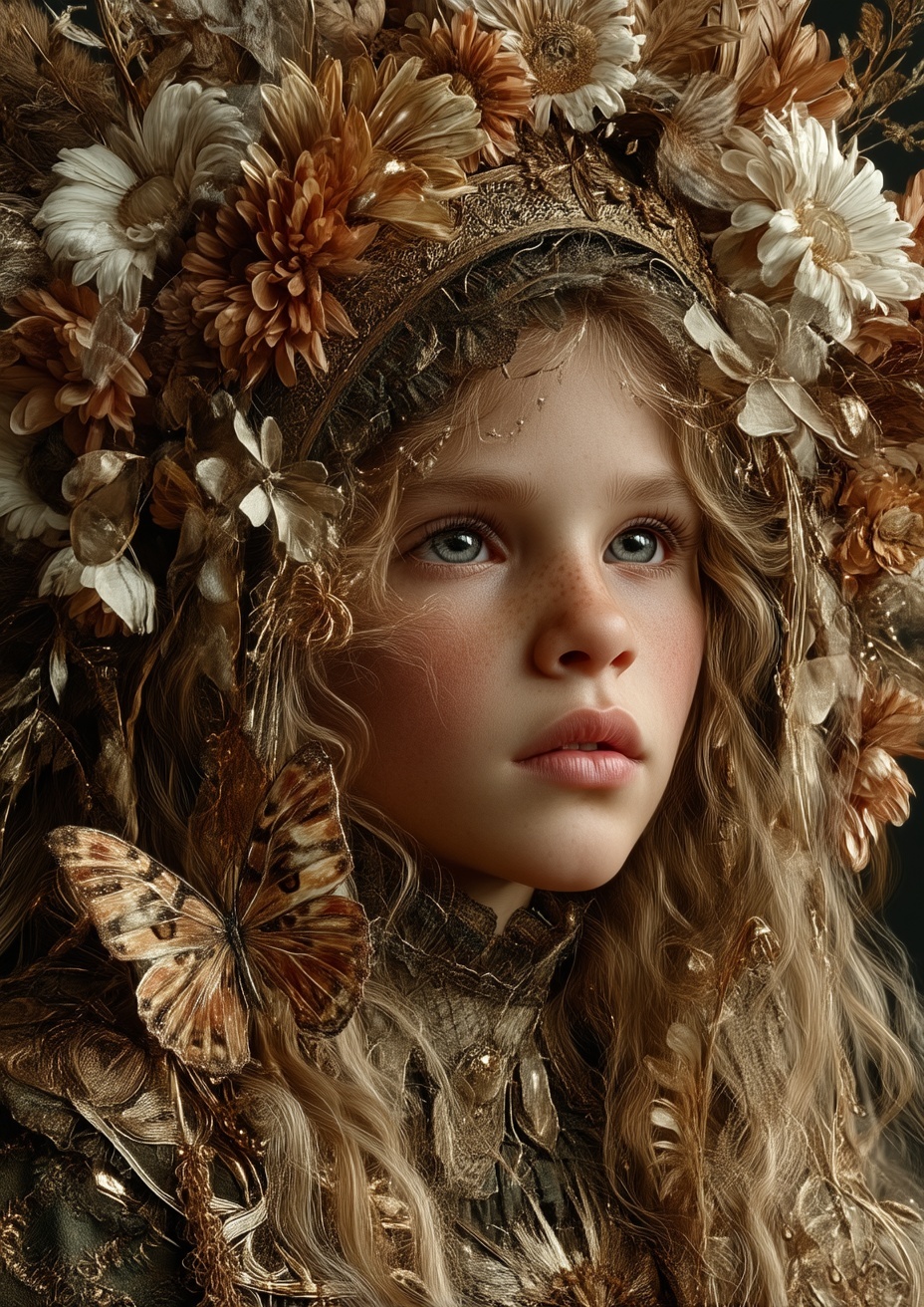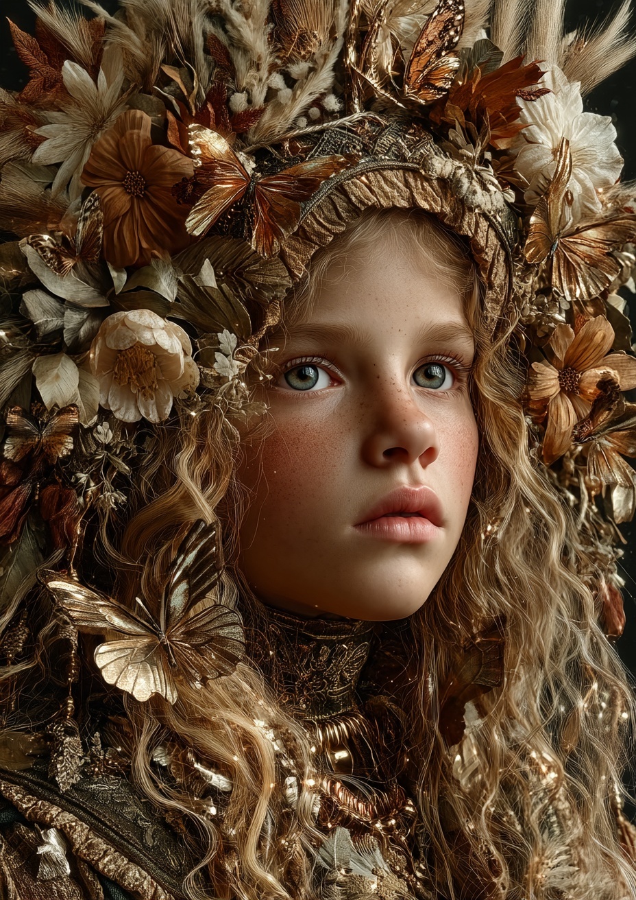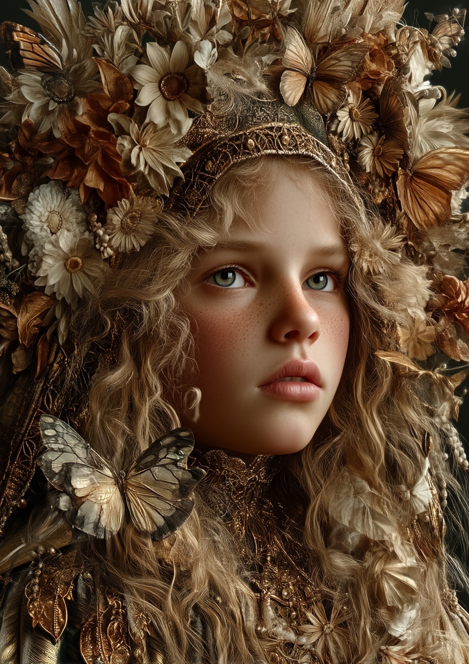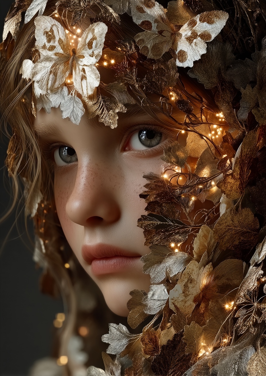 Мистический портрет с взглядом сквозь светящиеся цветы и бабочек.