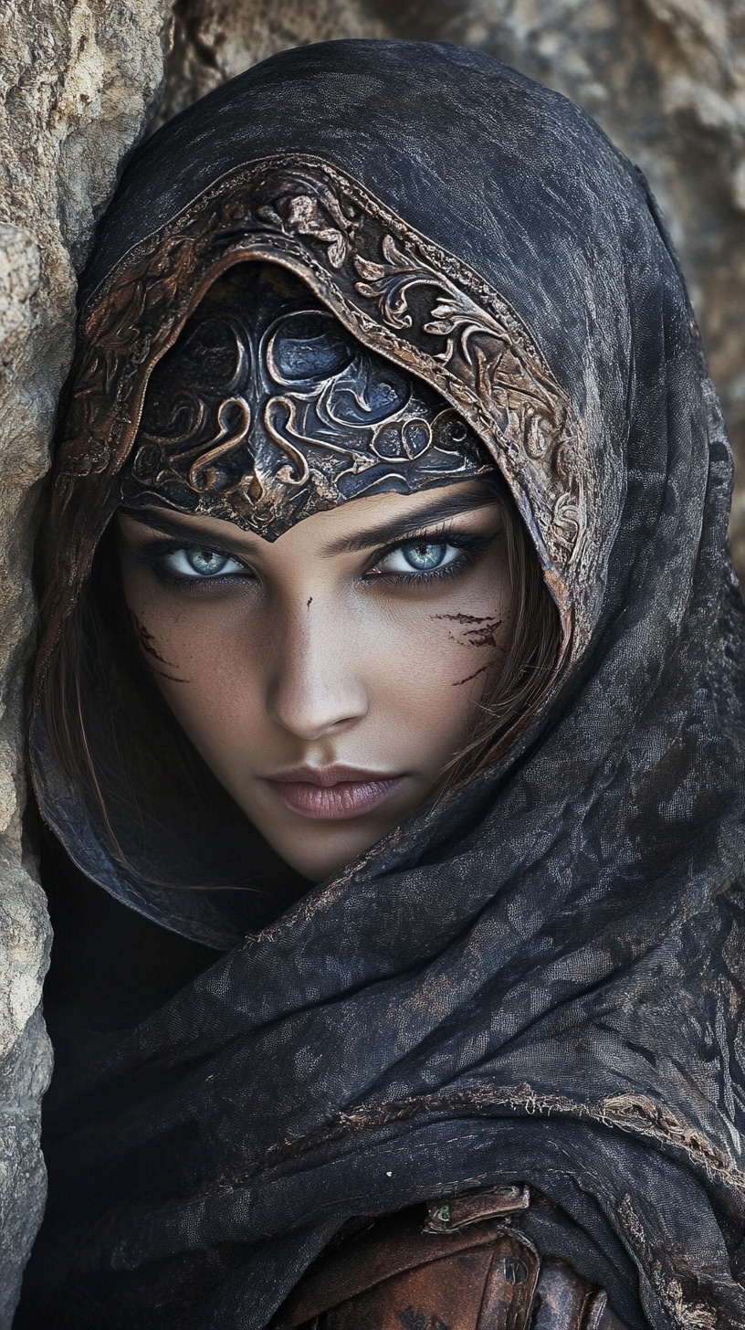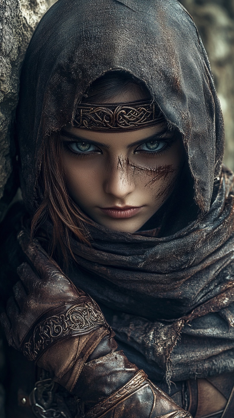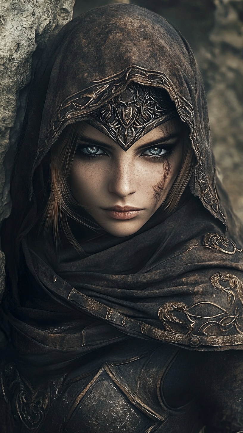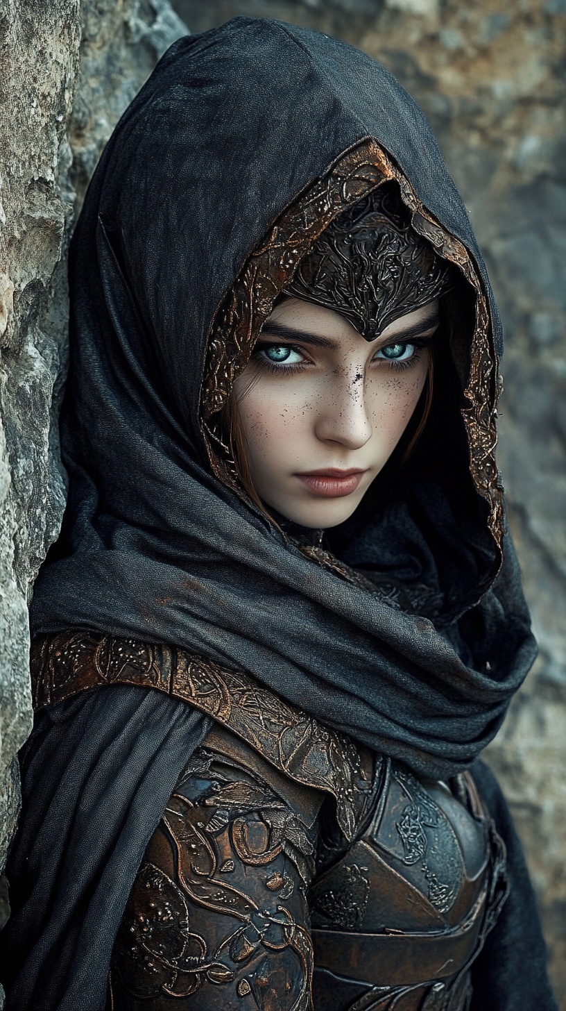 Молодая воительница в доспехах с кожаными вставками и тёмном плаще.