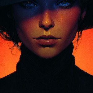 Портрет элегантной женщины со светящимися голубыми глазами и в черной шляпе.