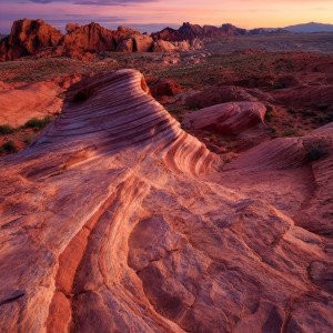 Красное песчаниковое образование с гладкими волнообразными узорами эрозии. Пустынный ландшафт с линией горизонта и градиентным закатным небом.