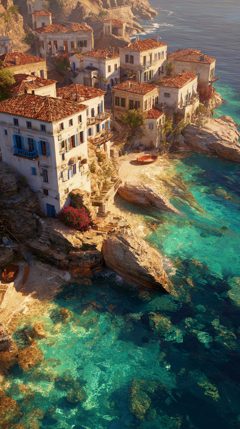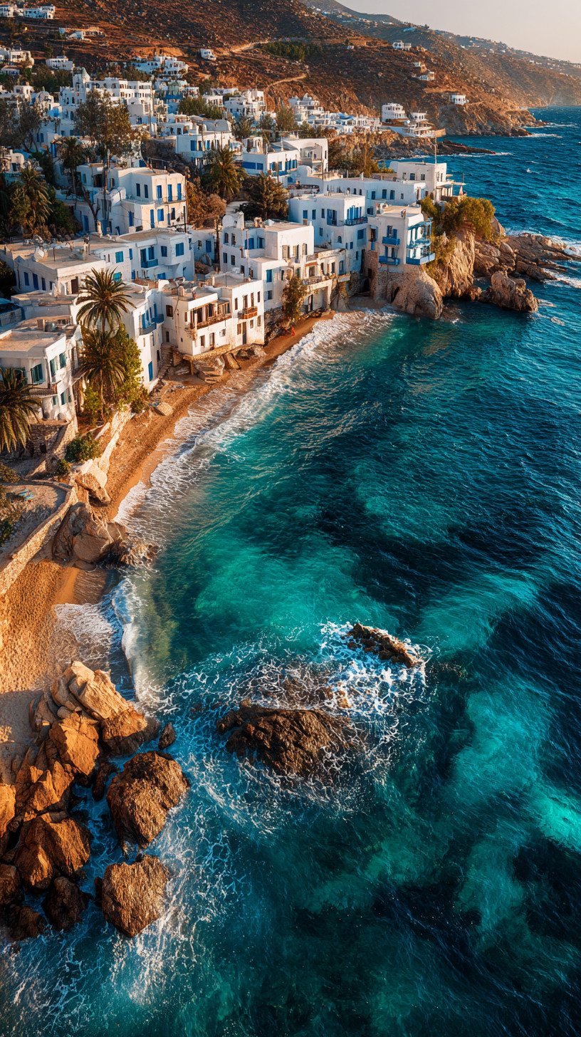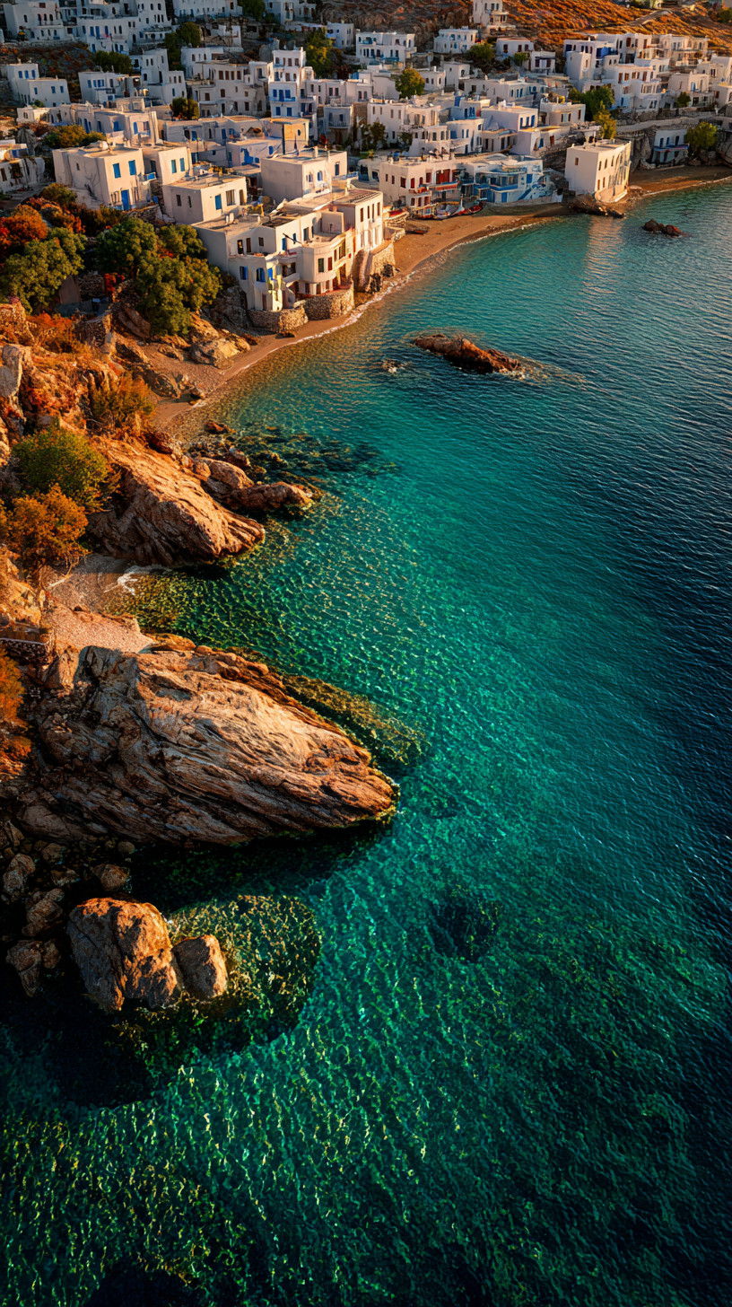 Вид на греческий прибрежный городок: белые дома с синими крышами, кристально чистая бирюзовая вода.