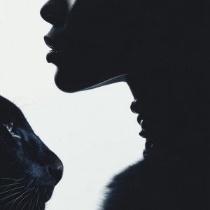 Профильный портрет в стиле Паоло Роверси и Клайва Эрроусмита: темнокожая женщина и черная пантера в полной гармонии.