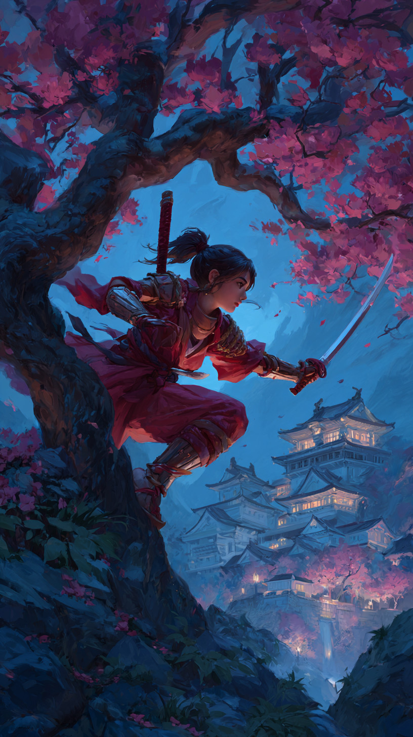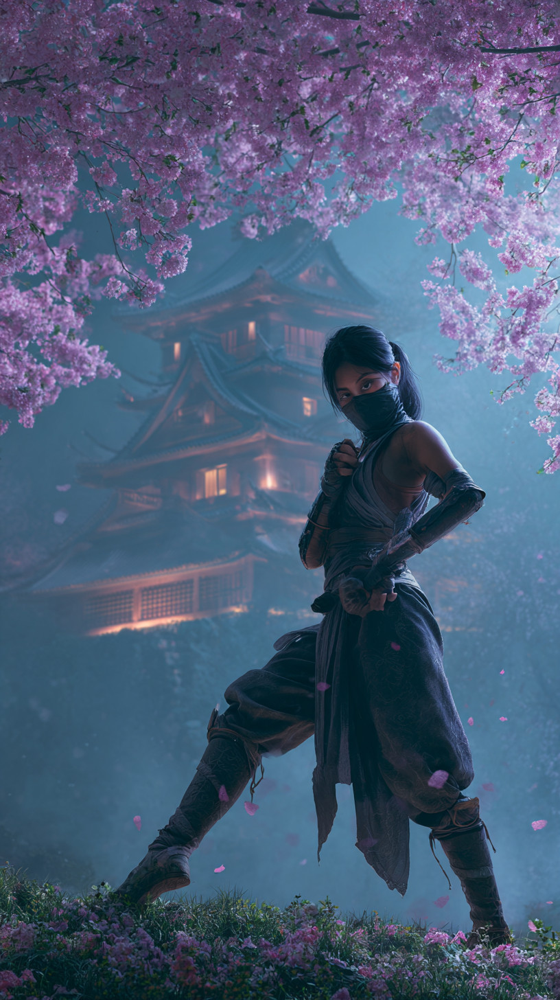 Женщина-ниндзя в героической позе на фоне сакуры и японского замка.