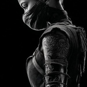 Женщина-ниндзя - за спиной катана, металлическая перчатка, татуировка на плече.