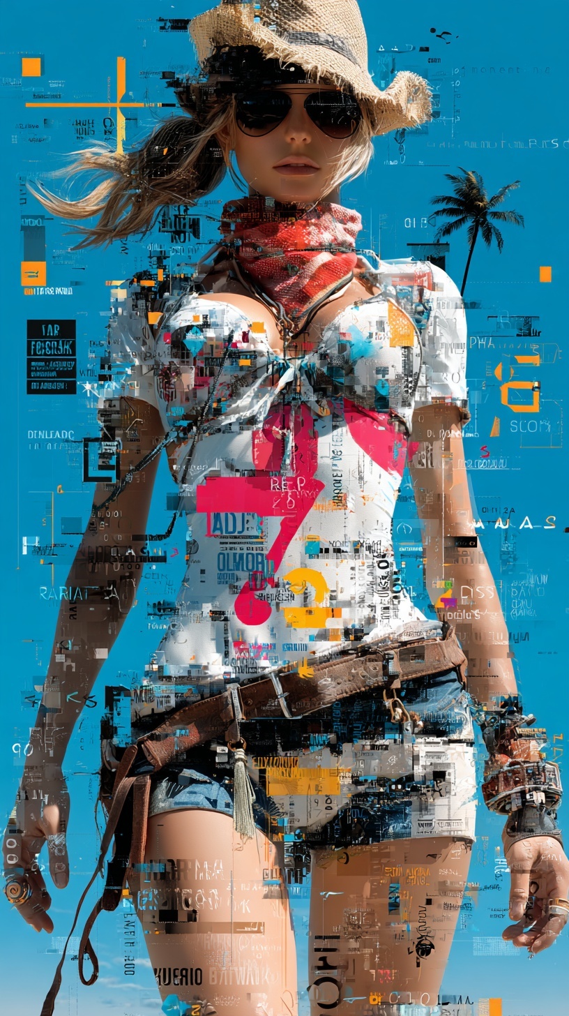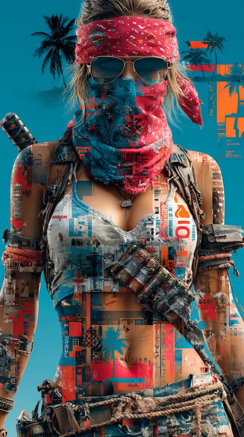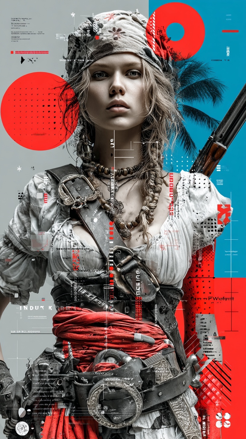 Промпт для Midjourney: Визуал женщины-пирата в динамичной позе на фоне тропического острова, в стиле Conrad Roset и Anna Dittmann