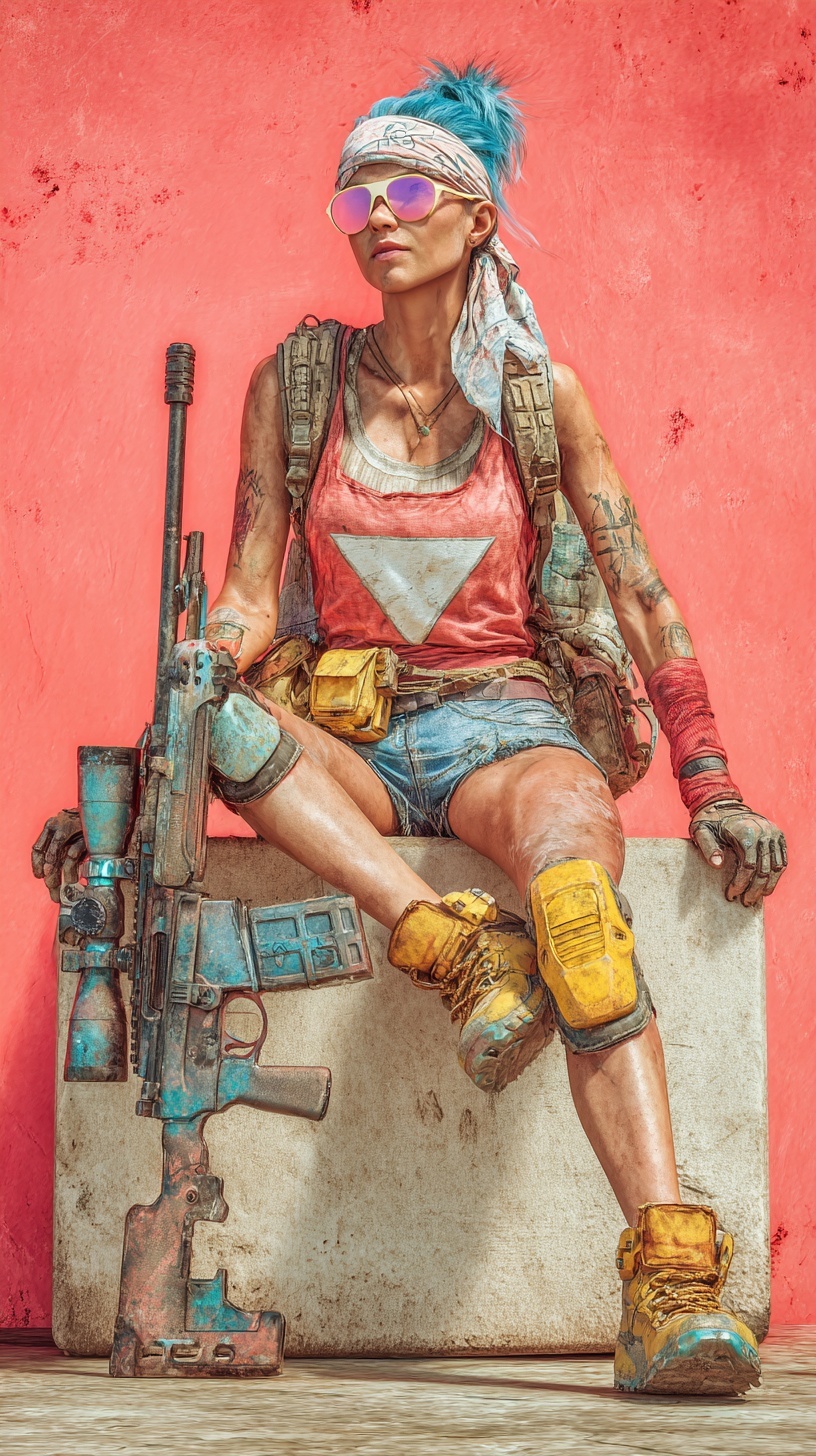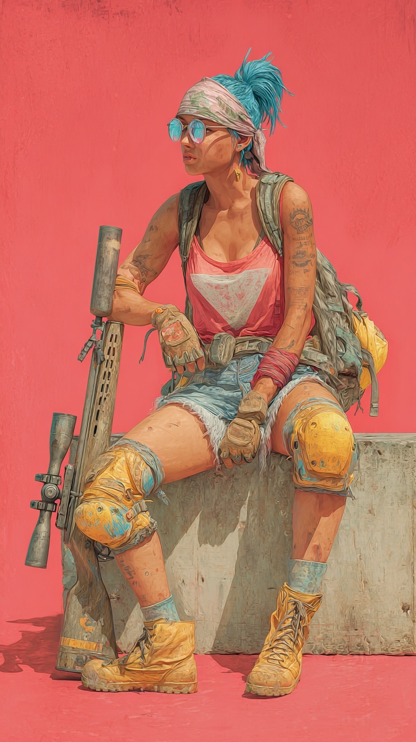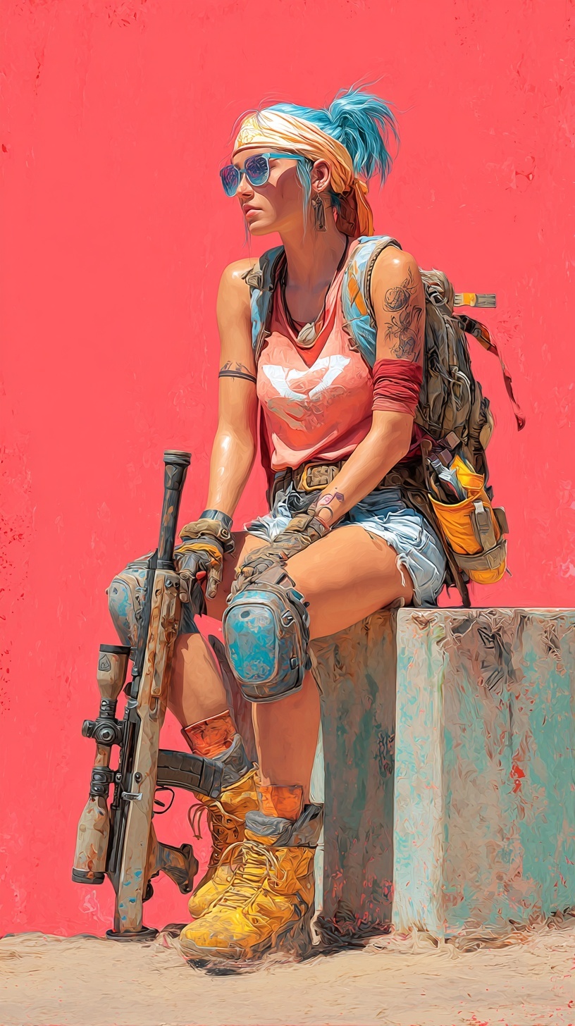 Женщины в постапокалиптическом стиле, она сидит на бетонном блоке с снайперской винтовкой