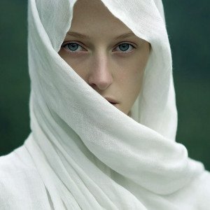 Крупный план женщины в струящемся белоснежном балахоне с капюшоном.